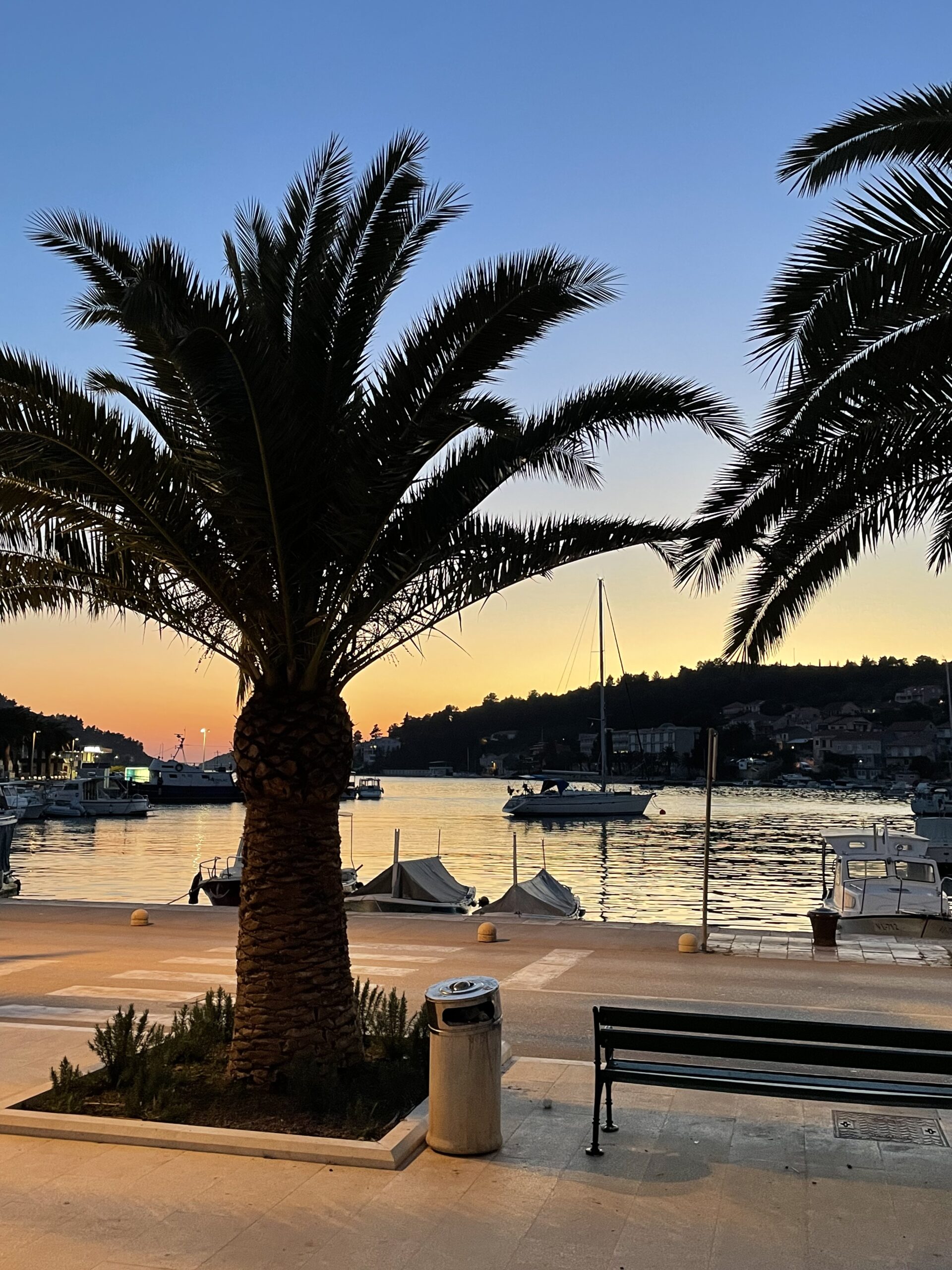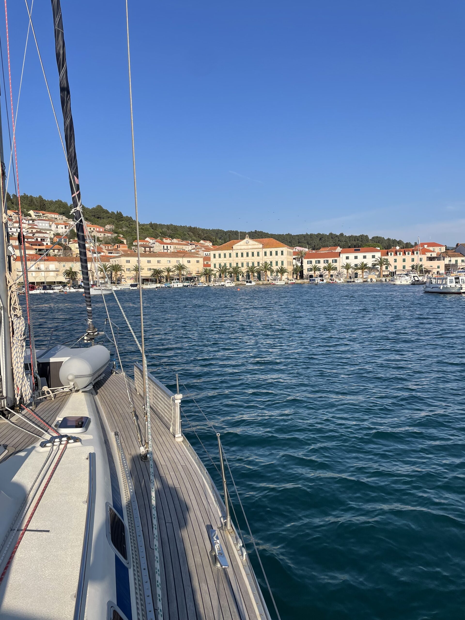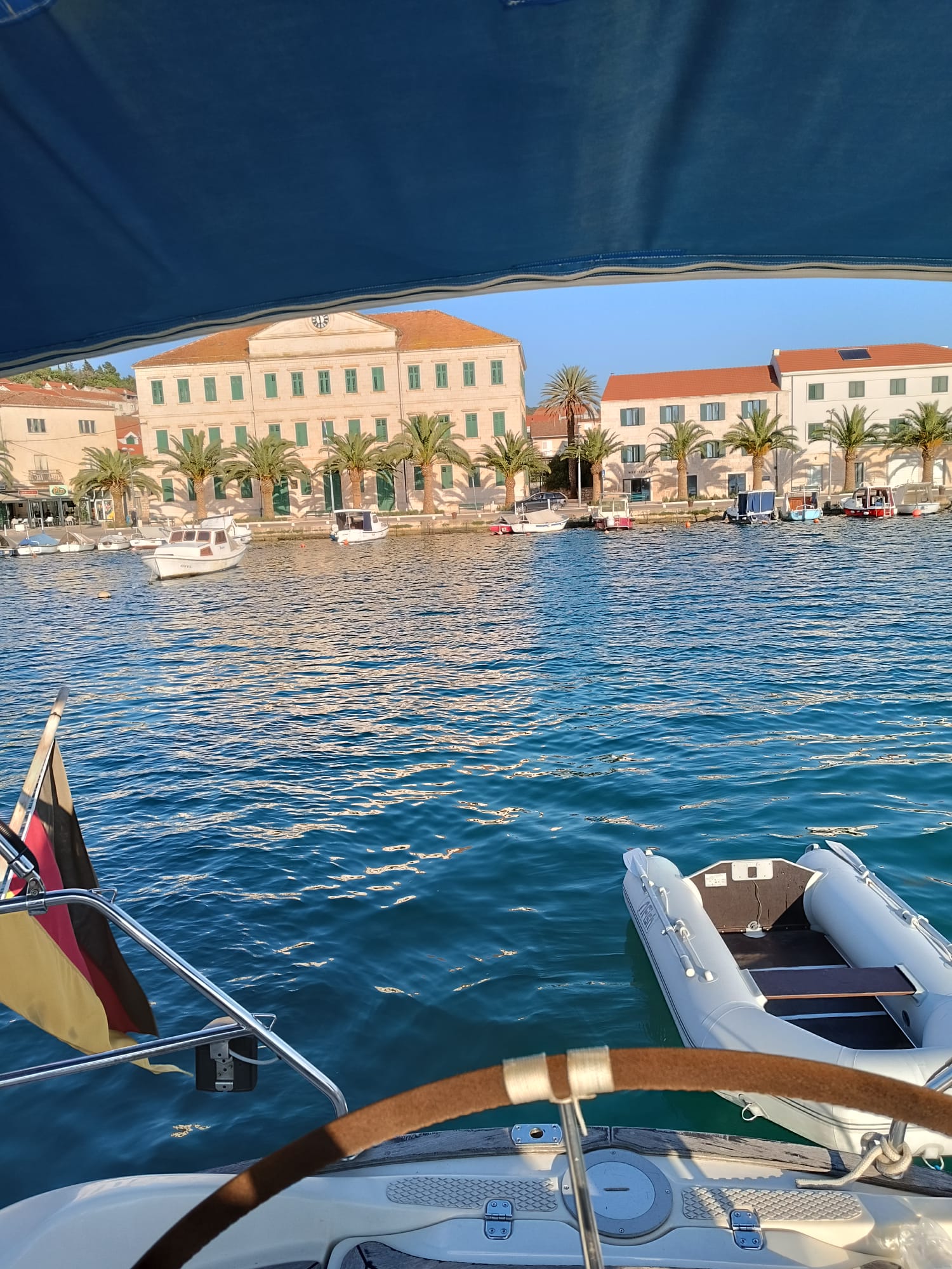 Nach dem Schwimmtraining und der anschließenden Dusche hieß es für uns wieder Anker auf, um ein Stück weiterzusegeln. Unser Ziel war heute Vela Luka und nach Möglichkeit dort an eine Boje. Wir hatten Glück und konnten uns an die gleiche Boje wie 2017 direkt vor der Promenade festmachen. Nach dem obligatorischen Anlegebier sind wir mit dem Beiboot (Dingy) an Land gepaddelt und haben uns noch etwas die Beine vertreten. Auf dem Weg sind wir an der Pizzeria „Alfa“ vorbeigekommen und haben eine Pizza und einen Salat gegessen.