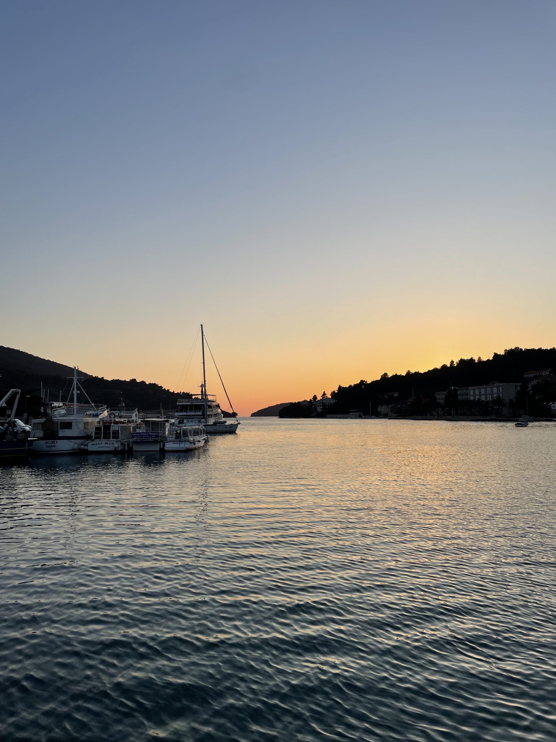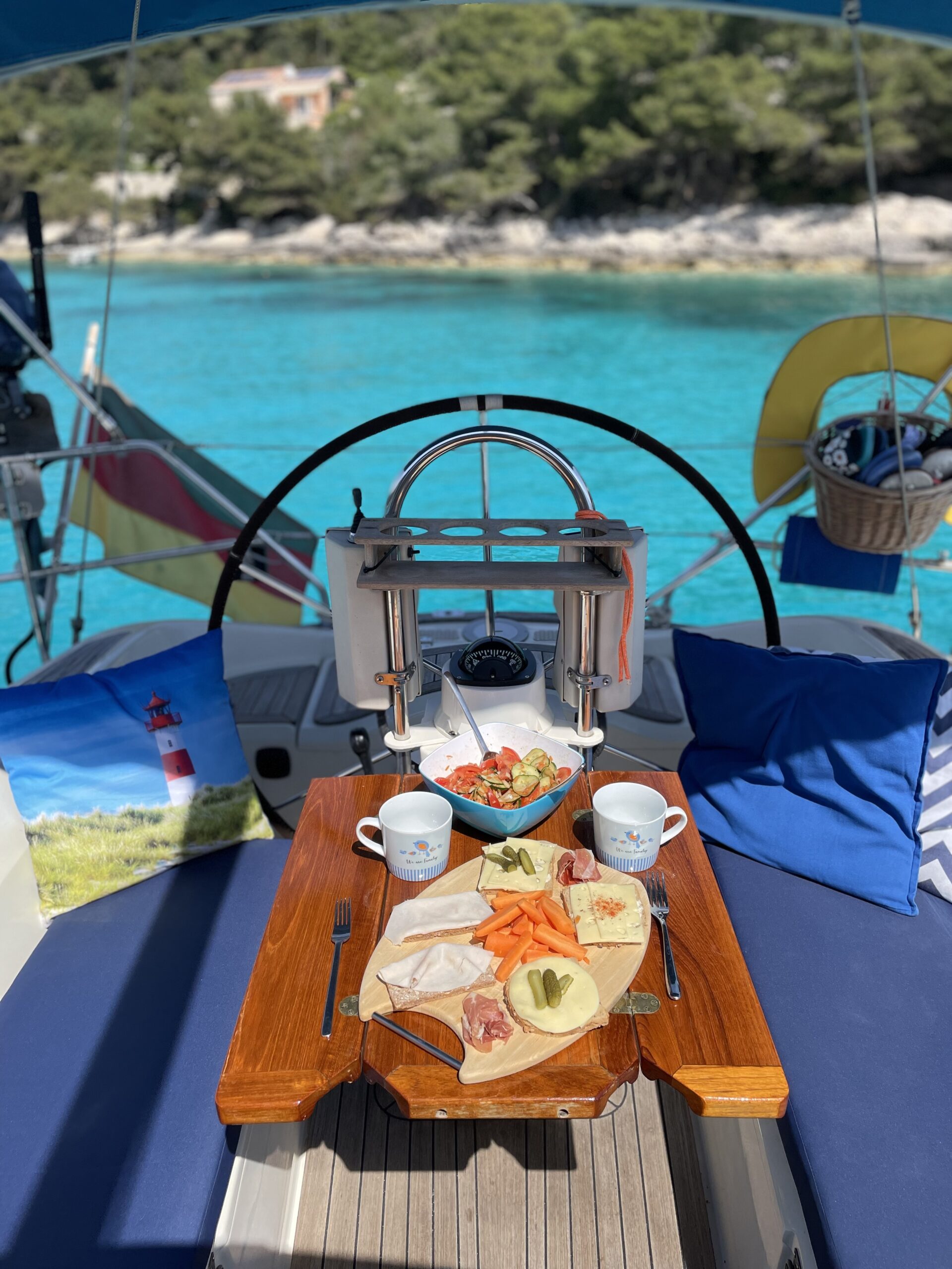 Nachdem wir dann Anker auf gegangen sind, ging es weiter Richtung Südosten nach Korčula. Ich war hier bereits 2017 einmal für eine Nacht mit dem Segelboot in Vela Luka an der Westseite der sehr grünen Insel. Nach gut 23 Seemeilen ließen wir den Anker in einer wunderschönen Bucht im Südwesten der Insel fallen. Anfangs hatten wir noch ordentlichen Meastral, also Wind aus Nordwesten. Im Laufe des Abends sollte dieser aber wieder abflauen und so verbrachten wir eine ruhige Nacht vor Anker auf 7m Wassertiefe und 20m Kette. Am Abend gab es Spaghetti mit Knoblauch-Schrimps und Blumenkohlsalat. Lecker! 😋