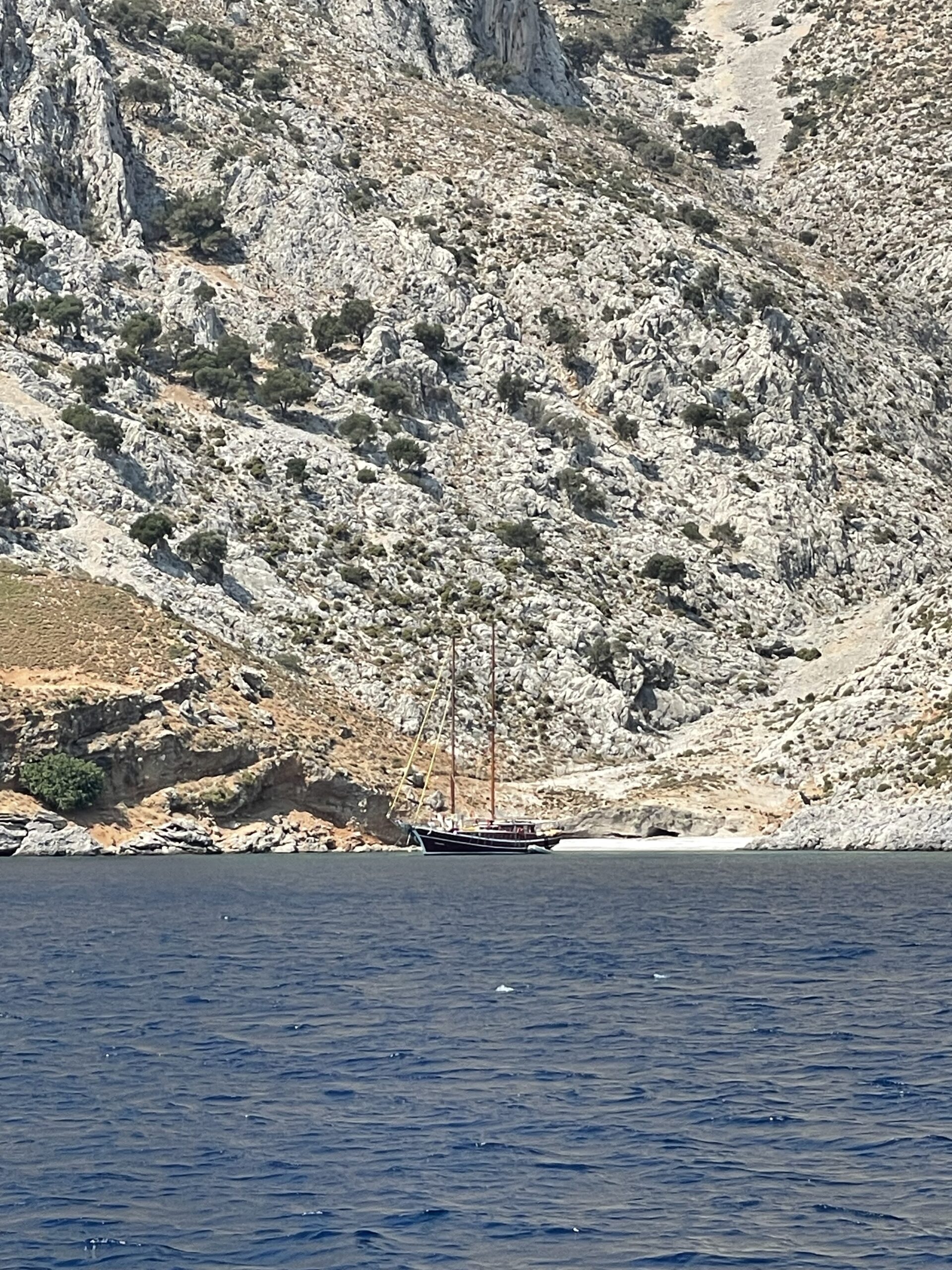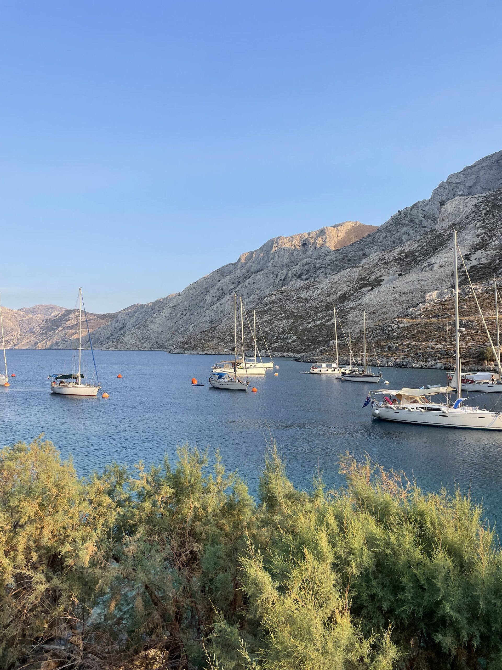 Am nächsten Tag ging es Anker auf und wir segelten ein Stück weiter auf unsere beliebte Insel Kalymnos. Wir machten in der schönen Bucht Palionisos an einer Boje der Taverne Ilias fest und genossen erst mal ein erfrischendes Bad im kristallklarem Wasser. Nach einem entspannten Nachmittag fuhren wir am Abend mit dem Beiboot an Land und erfreuten uns über ein leckeres Abendessen in der Taverne, etwas erhöht auf der Terrasse sitzend mit Blick auf die Bucht und die vielen Boote an den Bojen. 😋