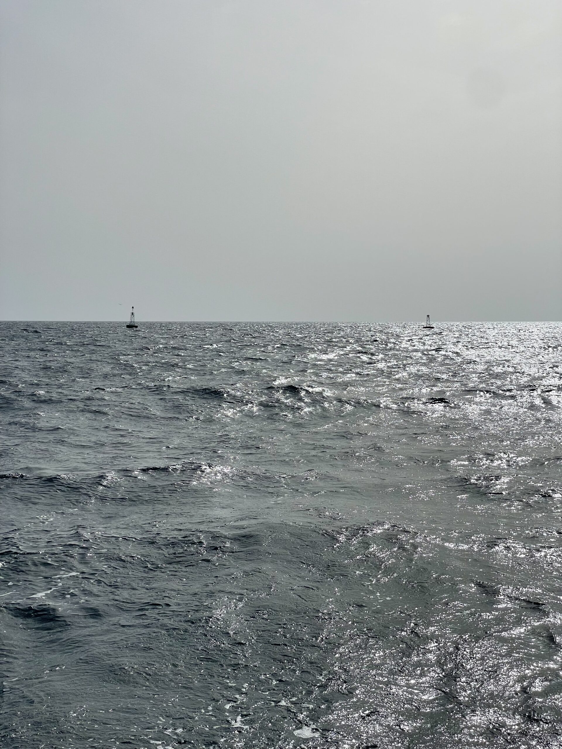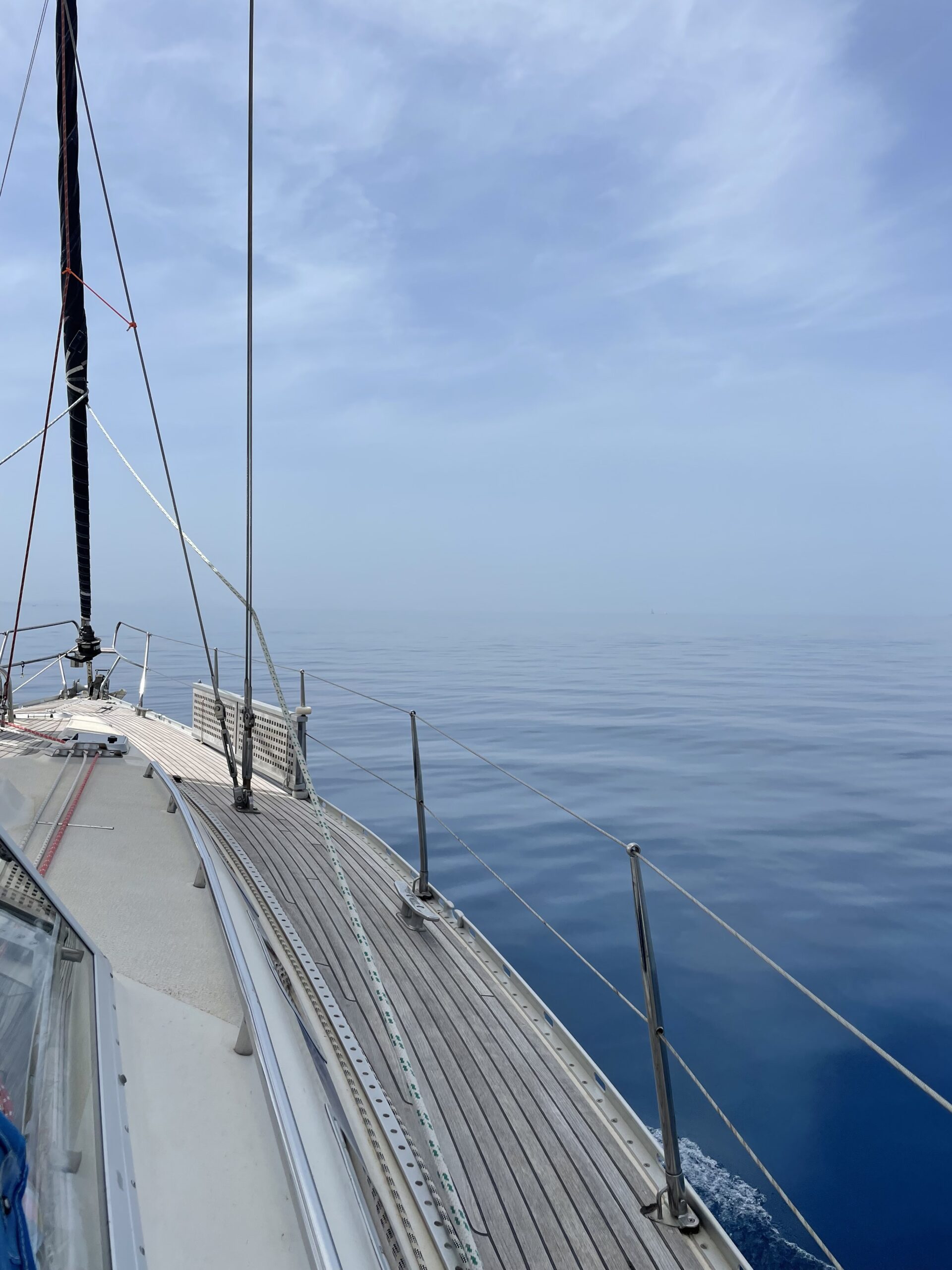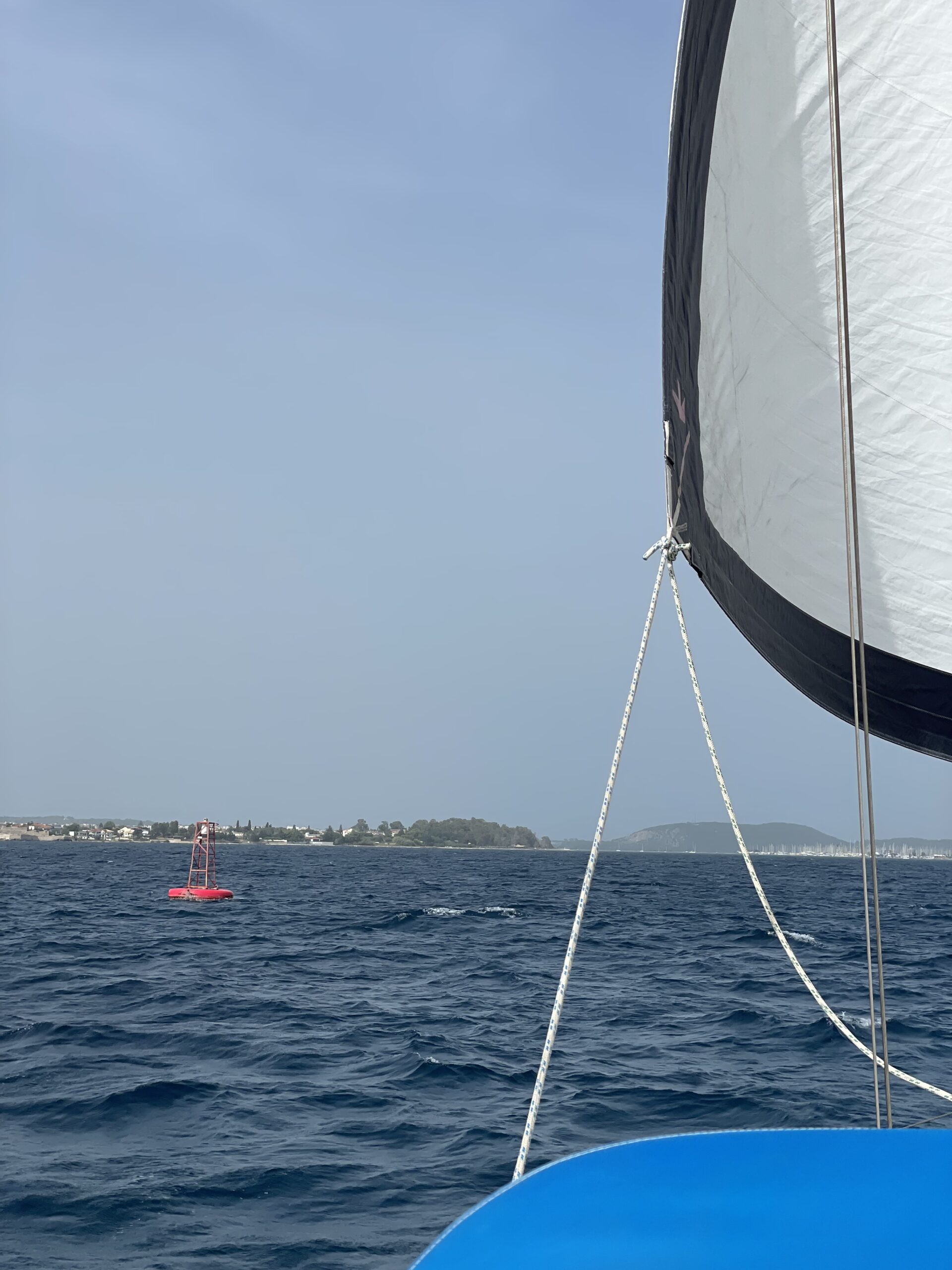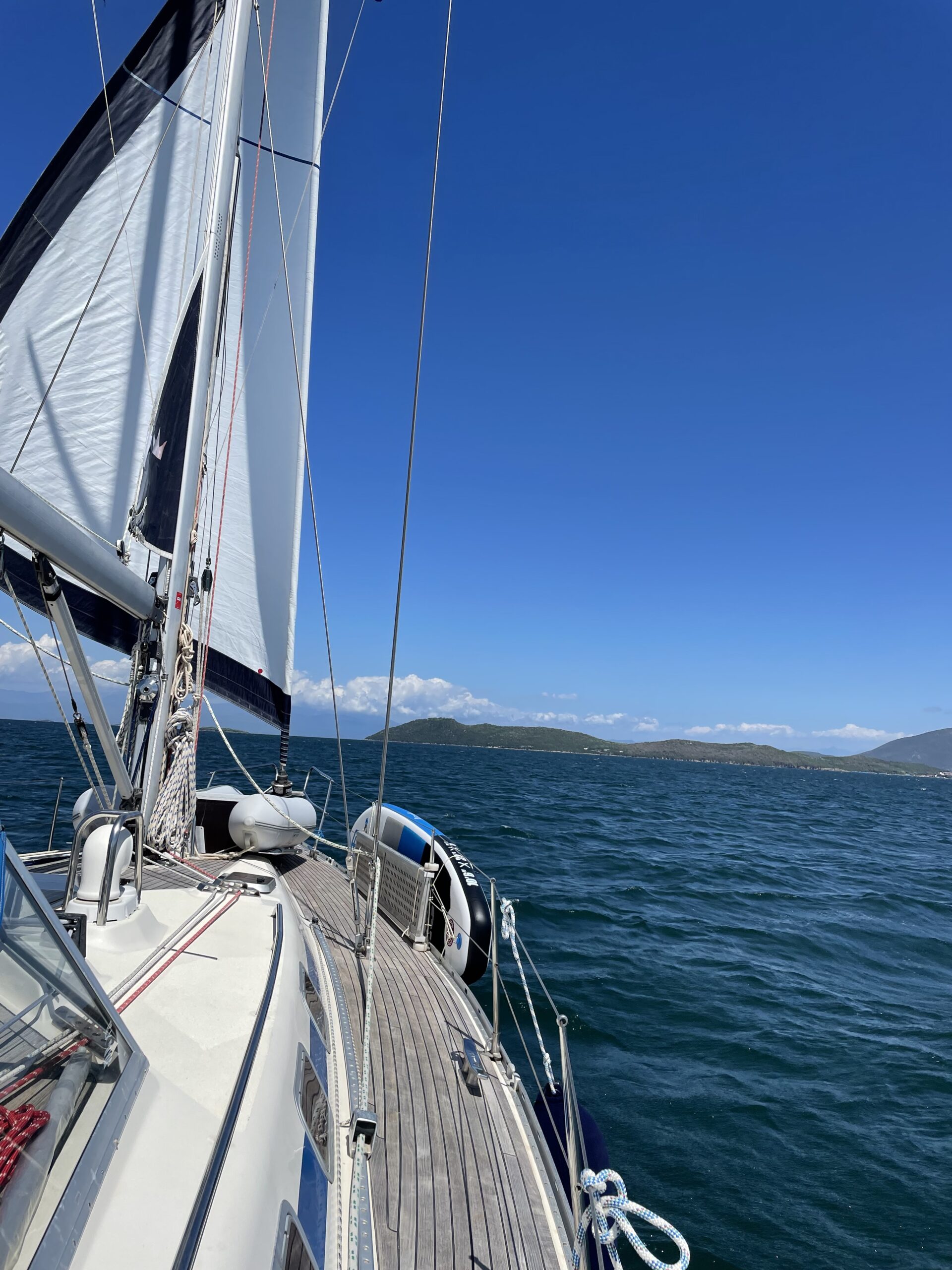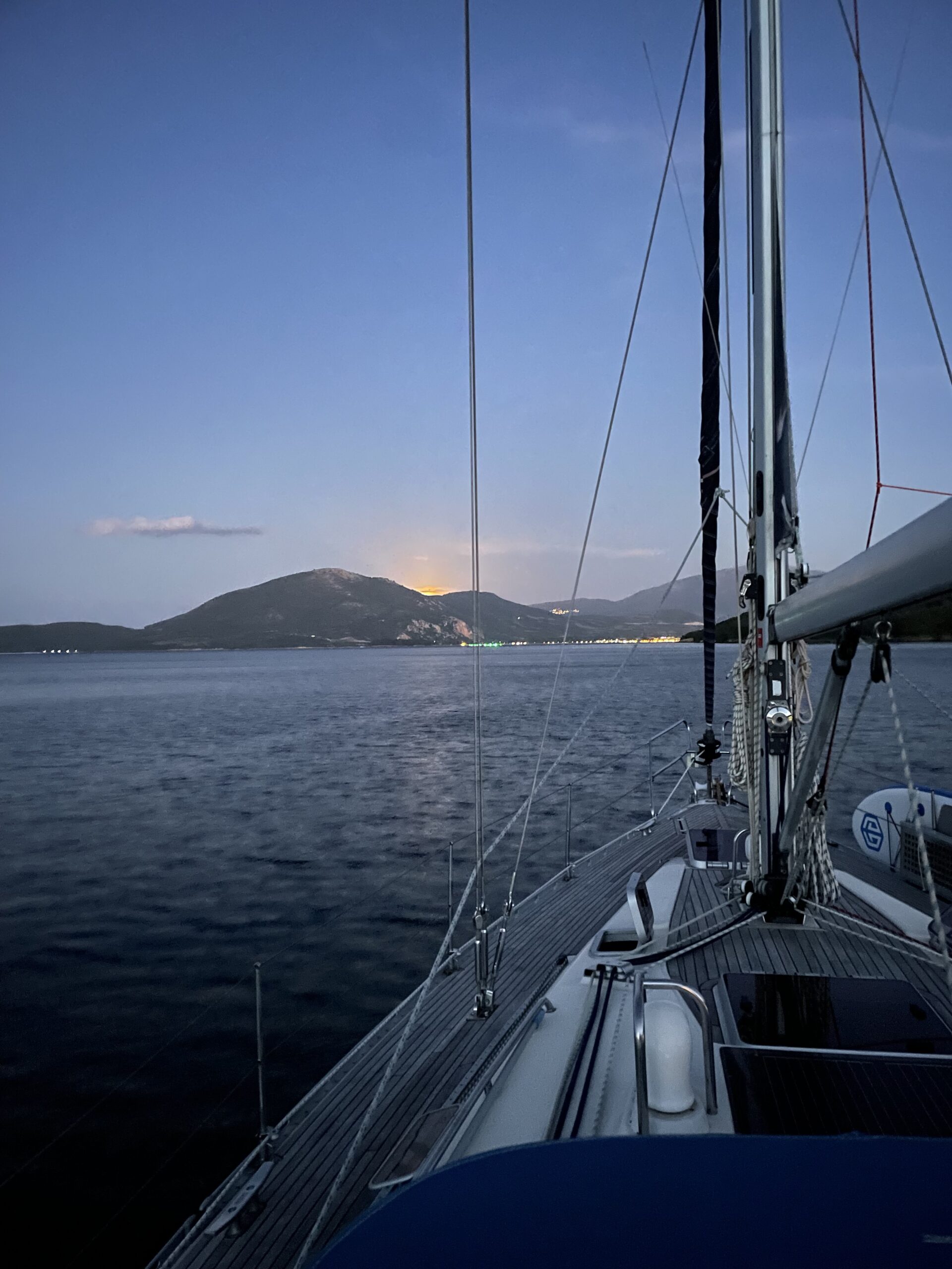 Nachdem wir die ausgenommenen Fische im Kühlschrank verstaut haben, sind wir Anker auf gegangen und konnten kurz darauf auch Segel setzen. Doch als wir die Bucht von Plataria verlassen haben, hat uns auch der Wind verlassen und so ging es unter Motor weiter. Da der vorhergesagte Wind noch etwas auf sich warten ließ, rollten wir die Segel wieder aus und lagen danach bei sehr wenig Wind bei. Ein Beilieger ist ein Segelmanöver, bei dem ein Segelboot so positioniert wird, dass es nahezu stillliegt, ohne Fahrt zu machen, aber dennoch stabil im Wasser bleibt. Dies wird in der Regel erreicht, indem die Segel so eingestellt werden, dass sie den Wind teilweise auffangen und gleichzeitig so ausbalanciert sind, dass sie das Boot stabilisieren.Vesperpause auf offener See – immer wieder schön. 😊