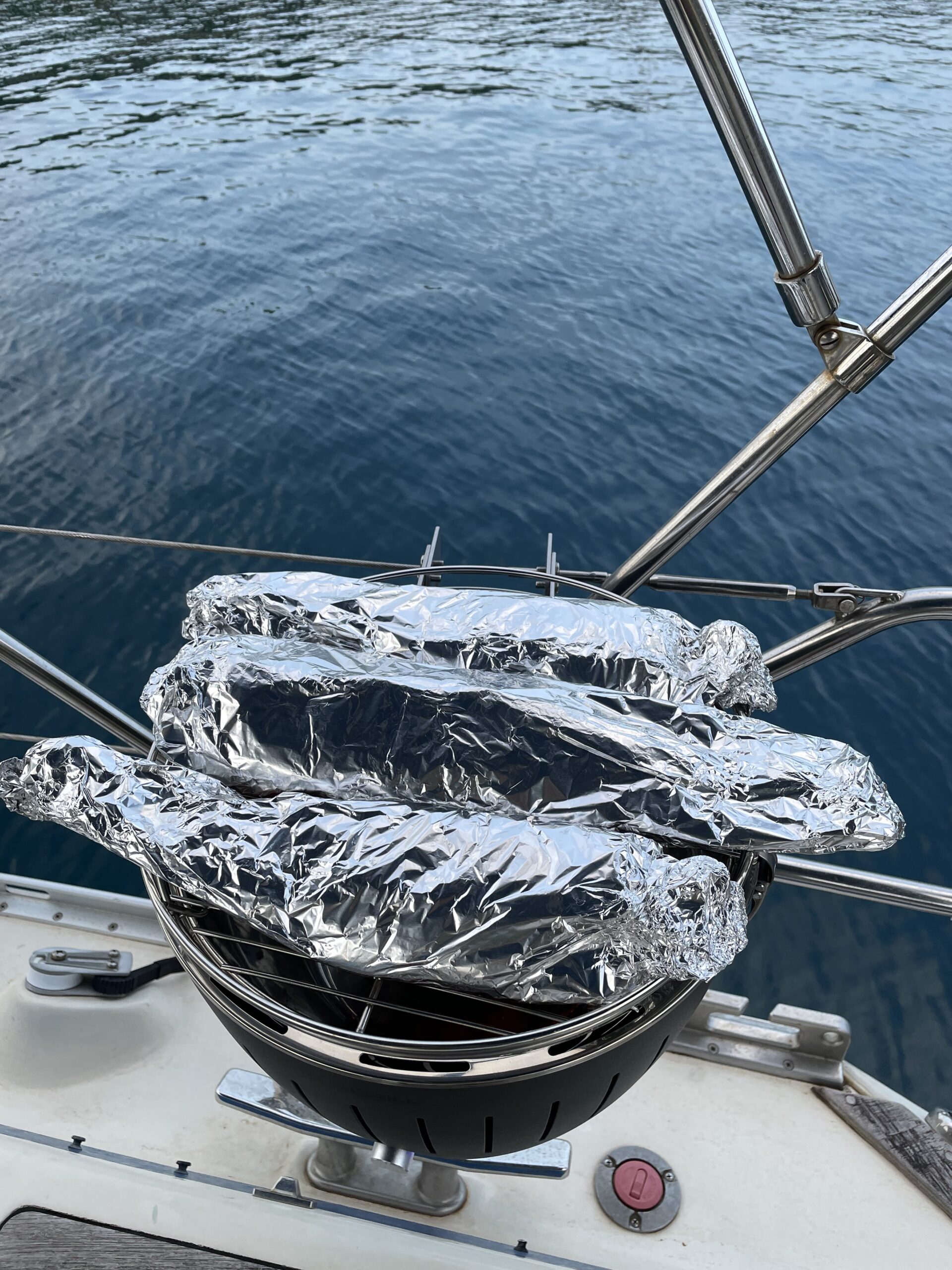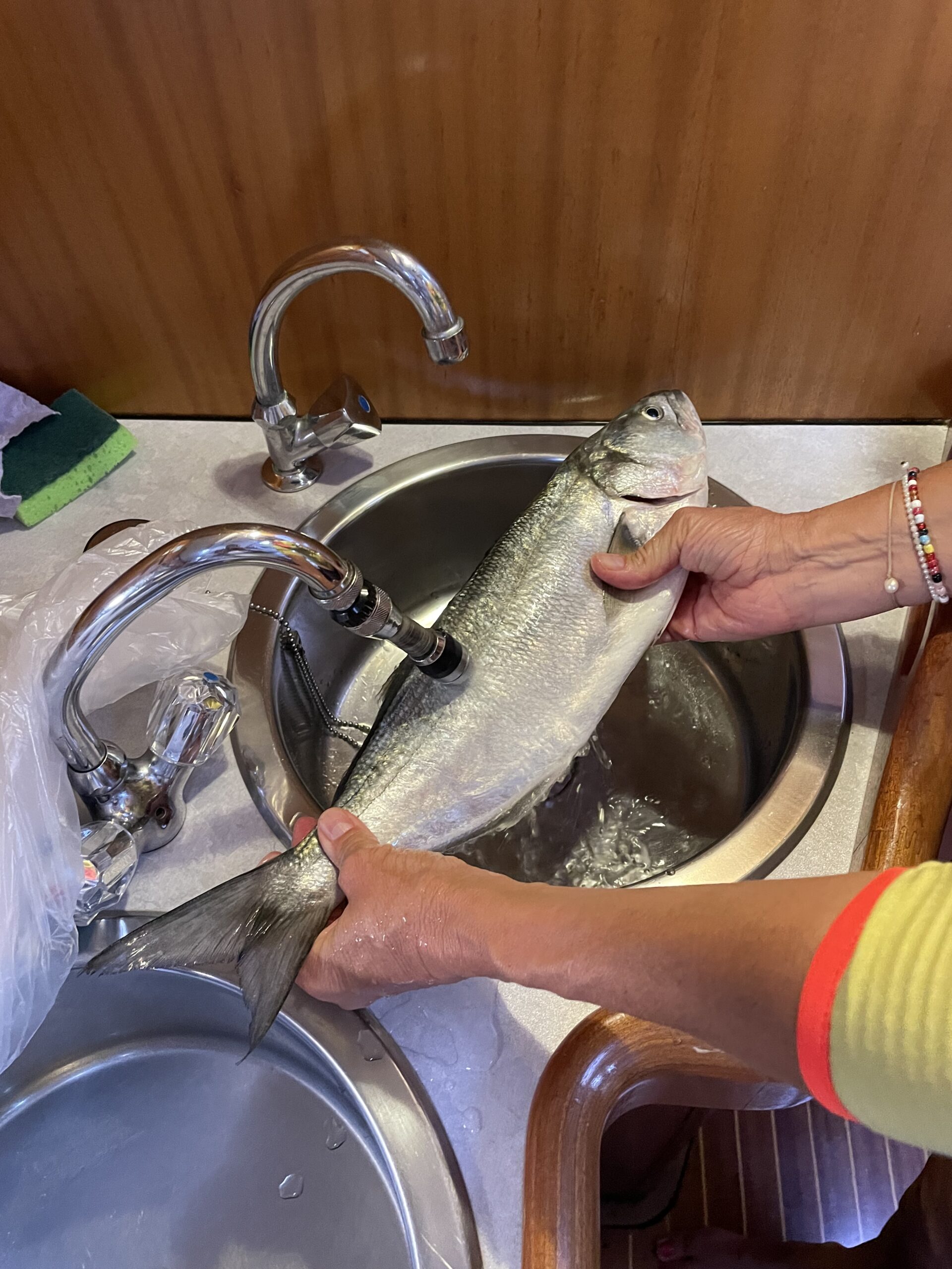 Während Nici und Silke die Fische für den Grill vorbereiteten, habe ich unseren Lotusgrill an den Seezaun gehängt und angefeuert. Mit dem Lüfter unten drin ist der Grill bereits nach ca. 5 Minuten einsatzbereit. Die Fische waren relativ groß (zusammen brachten sie drei Kilo auf die Waage), und so beschlossen wir, den Kopf schon vorher abzutrennen, da sie sonst nicht auf den Grill gepasst hätten. 🙈 Etwa 30 Minuten später waren die Blaufische fertig und wir konnten uns wieder über ein richtig leckeres Abendessen freuen!