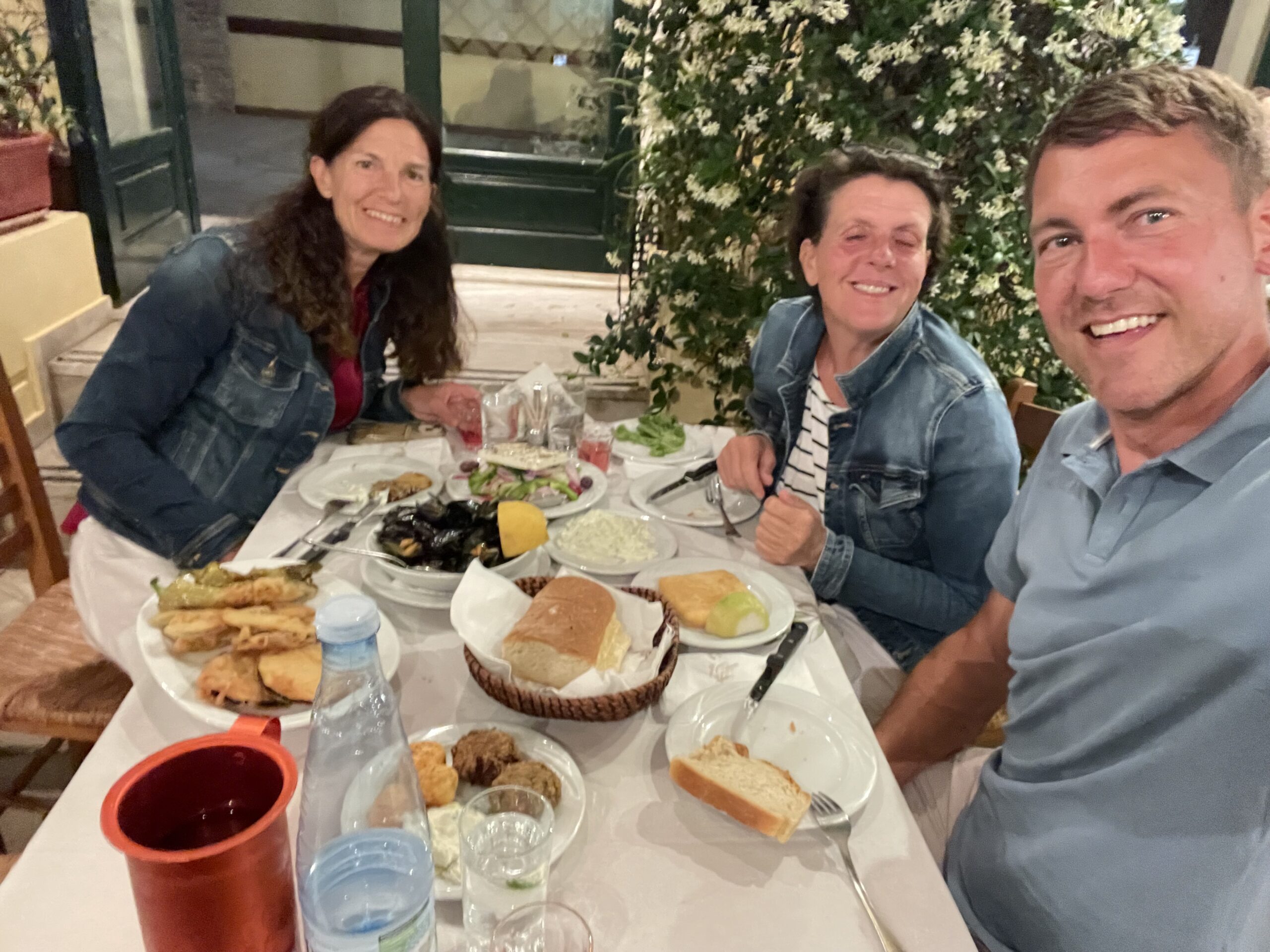 Am Nachmittag haben wir uns dann ein Auto geliehen, um mal wieder einen Großeinkauf zu tätigen und – um am nächsten Morgen unsere beiden Töchter Maike und Emma am Flughafen in Preveza abzuholen! 🥳 Darauf haben wir uns schon sehr gefreut, nach zehn Wochen, die wir mittlerweile schon unterwegs waren. Doch zuvor hat uns Silke (und in Gedanken auch Marc) am Abend zum Essen eingeladen und es war sehr sehr lecker. Vielen lieben Dank! 😊