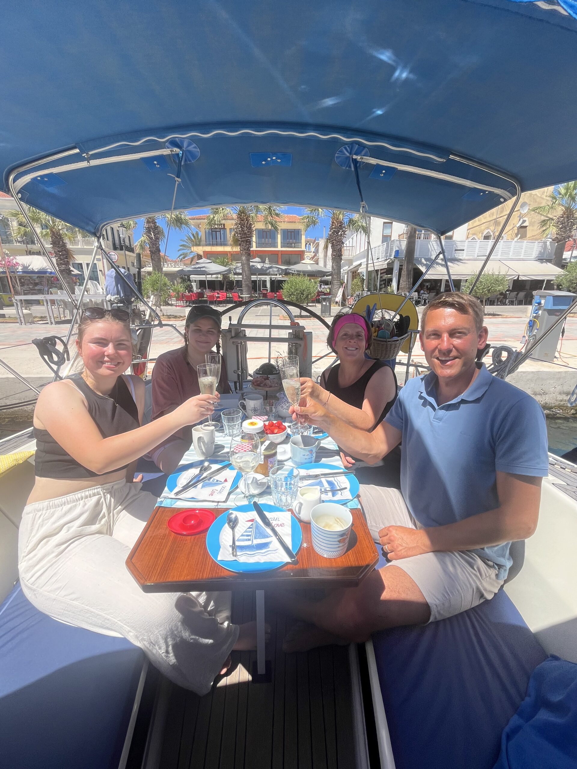 Doch im Mittelpunkt stand für uns der Besuch unserer Töchter Maike und Emma. Also große Wiedersehensfreude, Gepäck verstaut, alle in den Leihwagen verfrachtet und ab zum “Blonden”. Beide waren zum ersten Mal an Bord. Nach dem Verstauen des Gepäcks gab es erst mal ein Sektfrühstück oder mittlerweile eher ein Brunch. Dabei wurde auch beschlossen, schon heute die Stadtpier zu verlassen und ein paar Seemeilen zu segeln. Da für den Nachmittag relativ viel Wind vorhergesagt war, segelten wir etwas weiter hinein in den ambrakischen Golf und suchten uns einen schönen und gut geschützten Ankerplatz. Hier war dann erst mal chillen und baden angesagt. Am Abend haben wir lecker gekocht und sind relativ bald in unsere Kojen verschwunden.