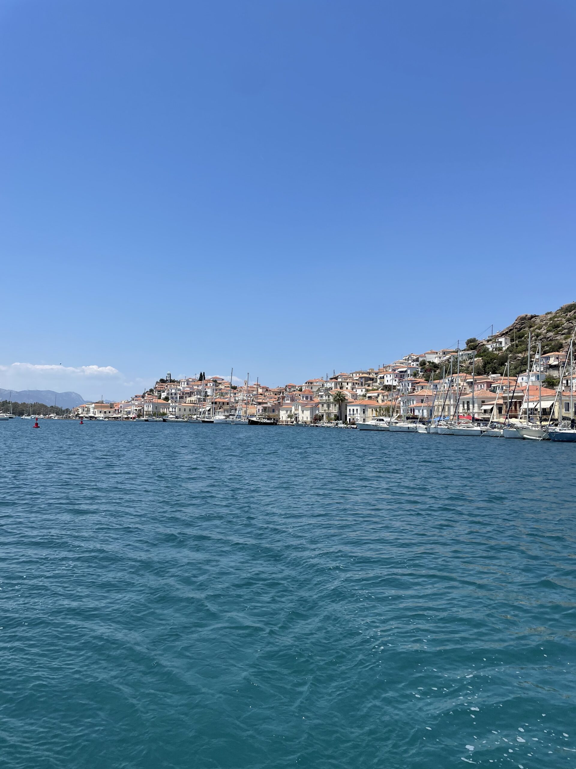 Die Hauptstadt, ebenfalls Poros genannt, ist eine malerische Stadt mit engen Gassen, neoklassizistischen Gebäuden und einem berühmten Uhrturm, von dem aus man einen atemberaubenden Blick auf das Meer und die gegenüberliegende Peloponnes hat. Besonders reizvoll sind die Tavernen am Hafen, die frische Meeresfrüchte und traditionelle griechische Küche servieren. Hier haben wir dann auch lecker zu Abend. 👍
