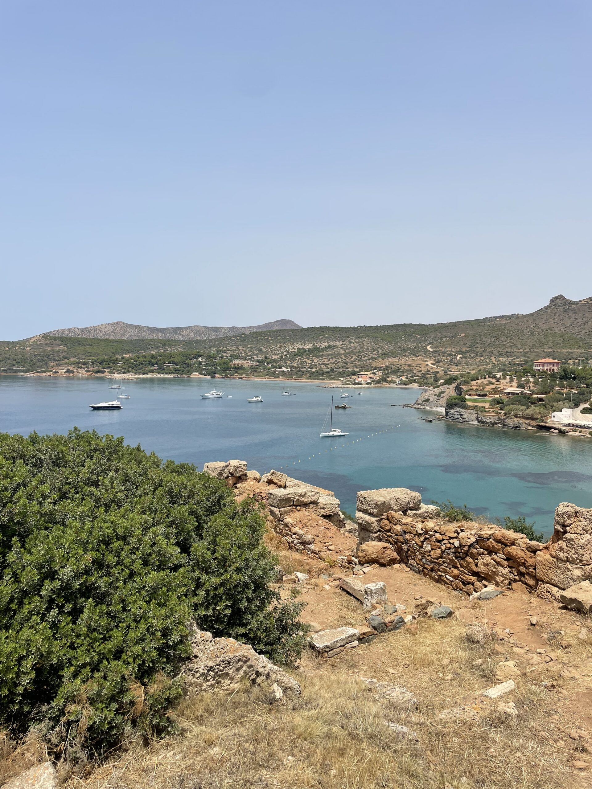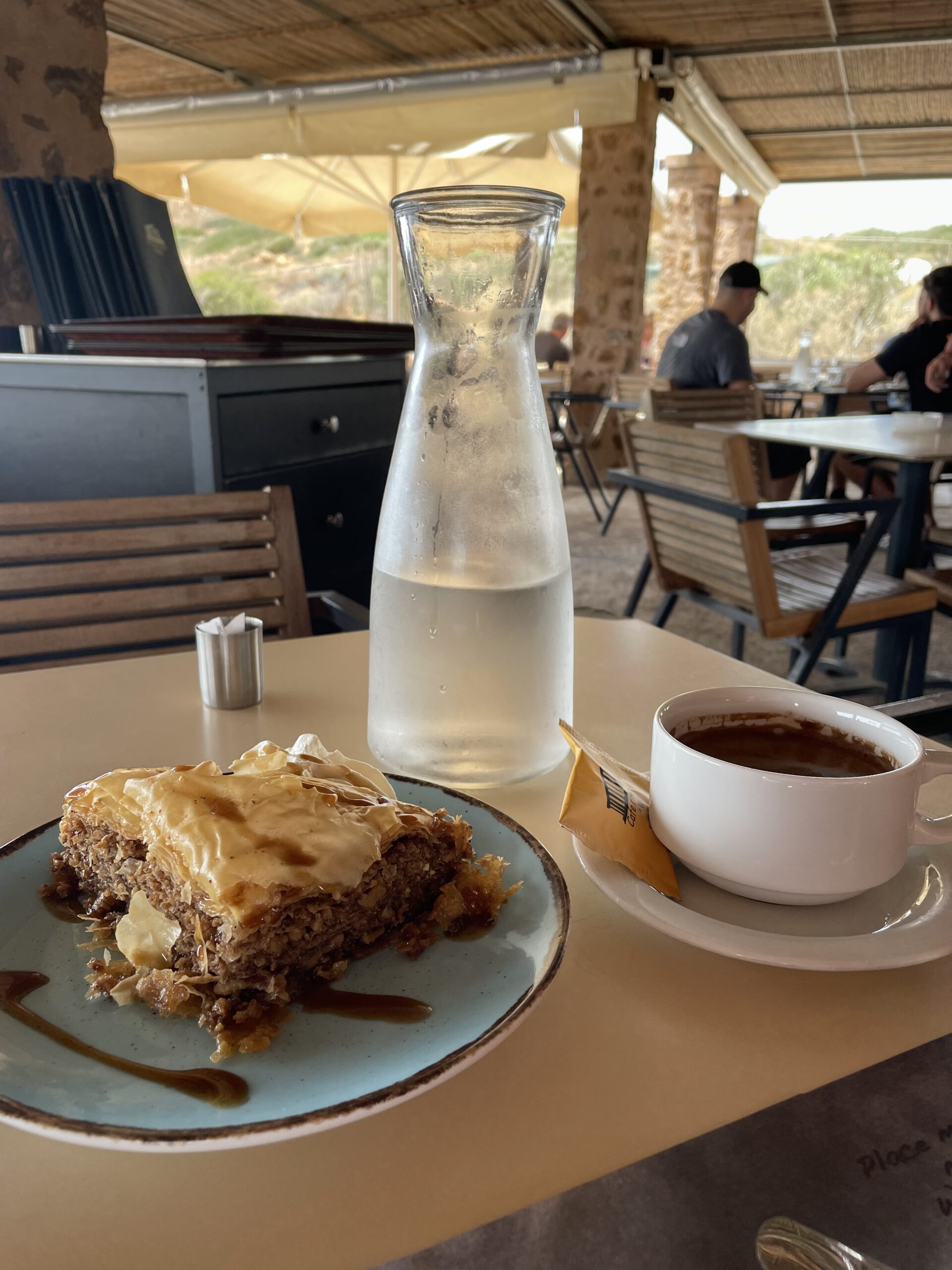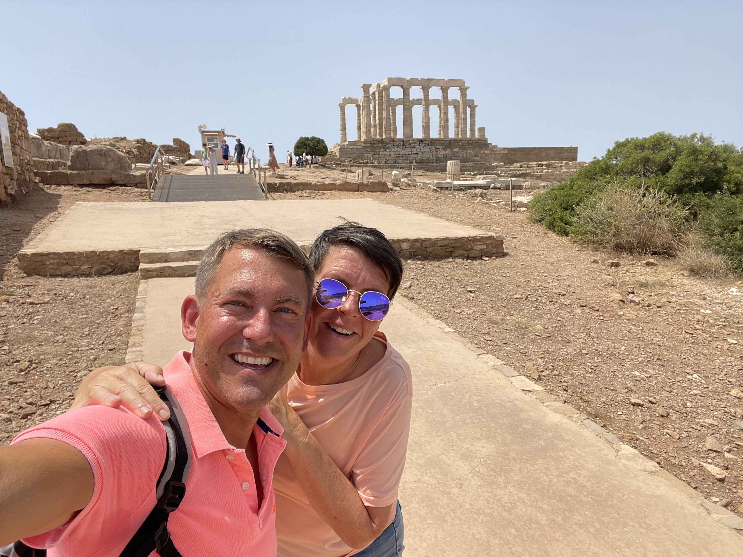 Am nächsten Morgen setzten wir mit dem Beiboot über und sind auf den Hügel zum Tempel des Poseidon aufgestiegen. Nach der Besichtigung des beeindruckenden Bauwerkes haben wir uns im Tempelkaffee noch einen Cappuccino freddo (kalt mit Eiswürfeln) und eine Portion Baklava gegönnt – lecker! 😋