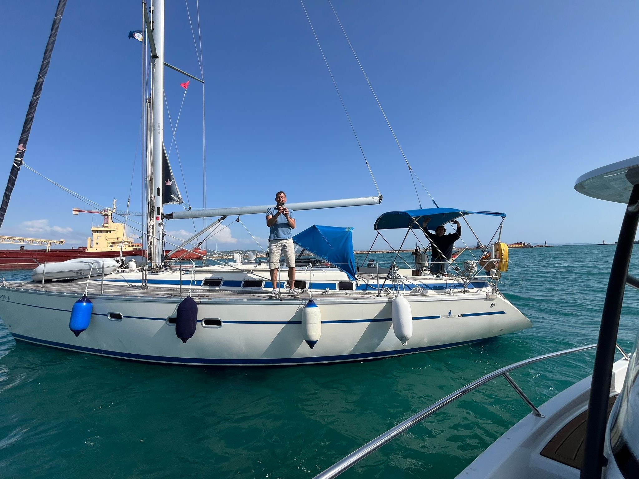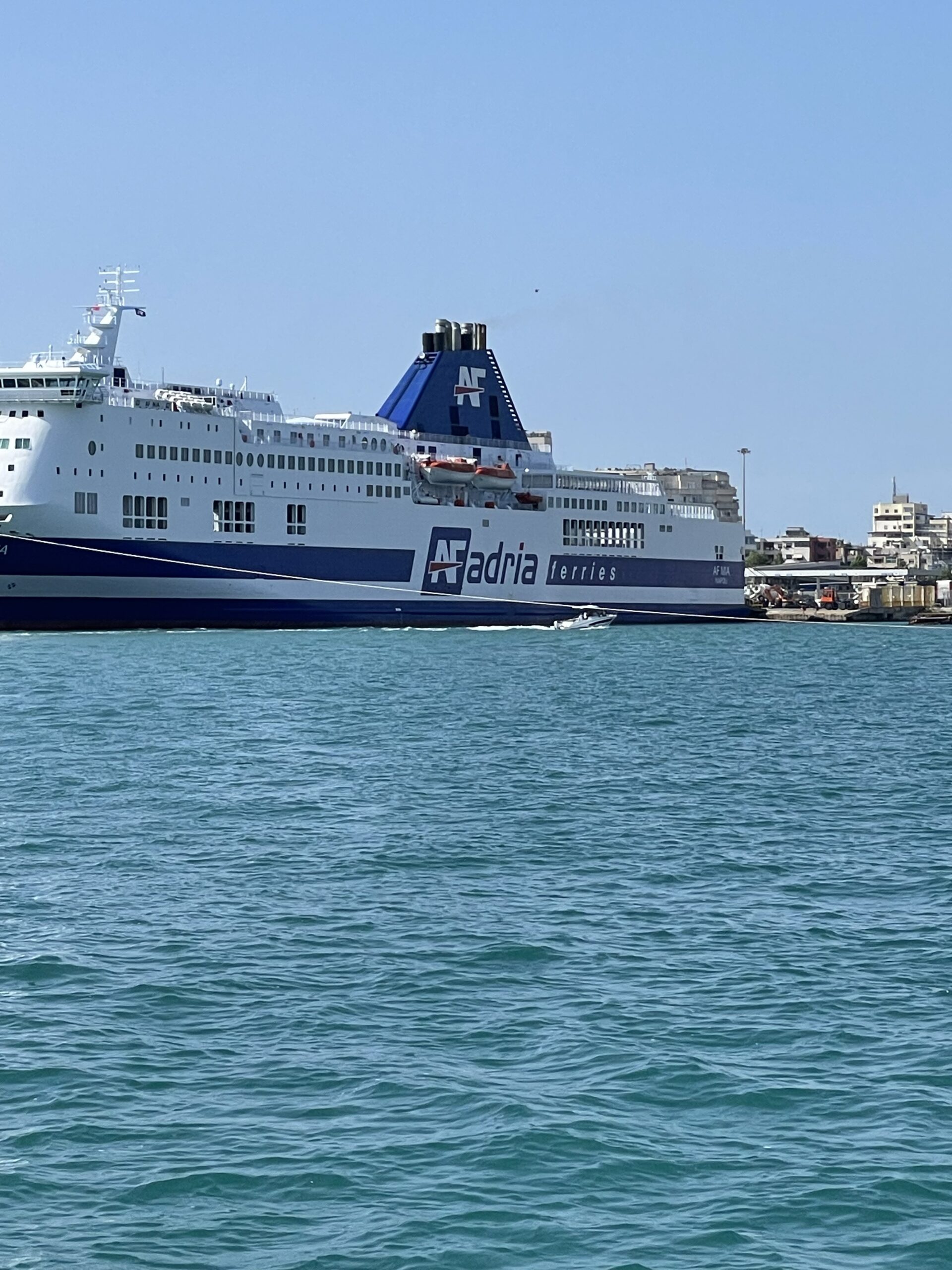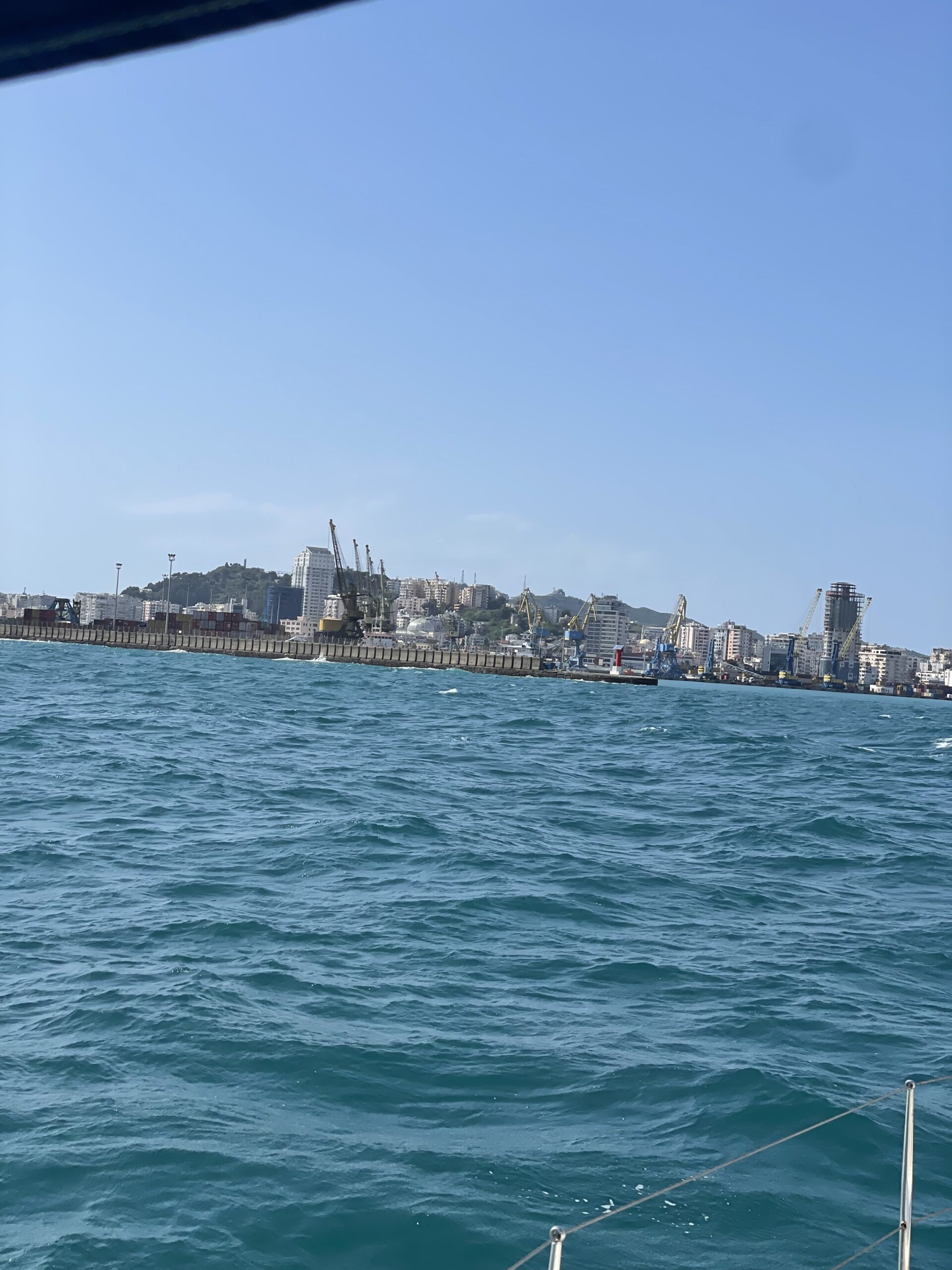 Im Laufe des Tages nahm der Wind aus Südwest ordentlich zu und so baute sich auch eine anständige Welle auf. In Dürres haben wir einen Liegeplatz in einer “Marina” reserviert. Die “Cristian Marine Dürres” befand sich in einem Teil des Industriehafens. Am Nachmittag erhielt ich dann die Nachricht, dass wir den Liegeplatz aufgrund der Wetterbedingungen und des starken Windes aktuell nicht anlaufen können. Die Fähre aus Italien war mit einer Vorleine quer über das gesamte Hafenbecken abgesichert und blockierte damit die Zufahrt zu unserem Liegeplatz. Da Kerstin und Silke bis 18:00 Uhr am Flughafen in Tirana sein mussten, haben wir sie im Hafenbecken abgesetzt. Nein, nicht einfach so. 😜 Cristian Marine hat ein Motorboot rausgeschickt und hat die beiden à la James Bond von unserem Boot abgeborgen. Das ging am Ende alles ganz schnell und es blieb nicht viel Zeit, uns zu verabschieden.