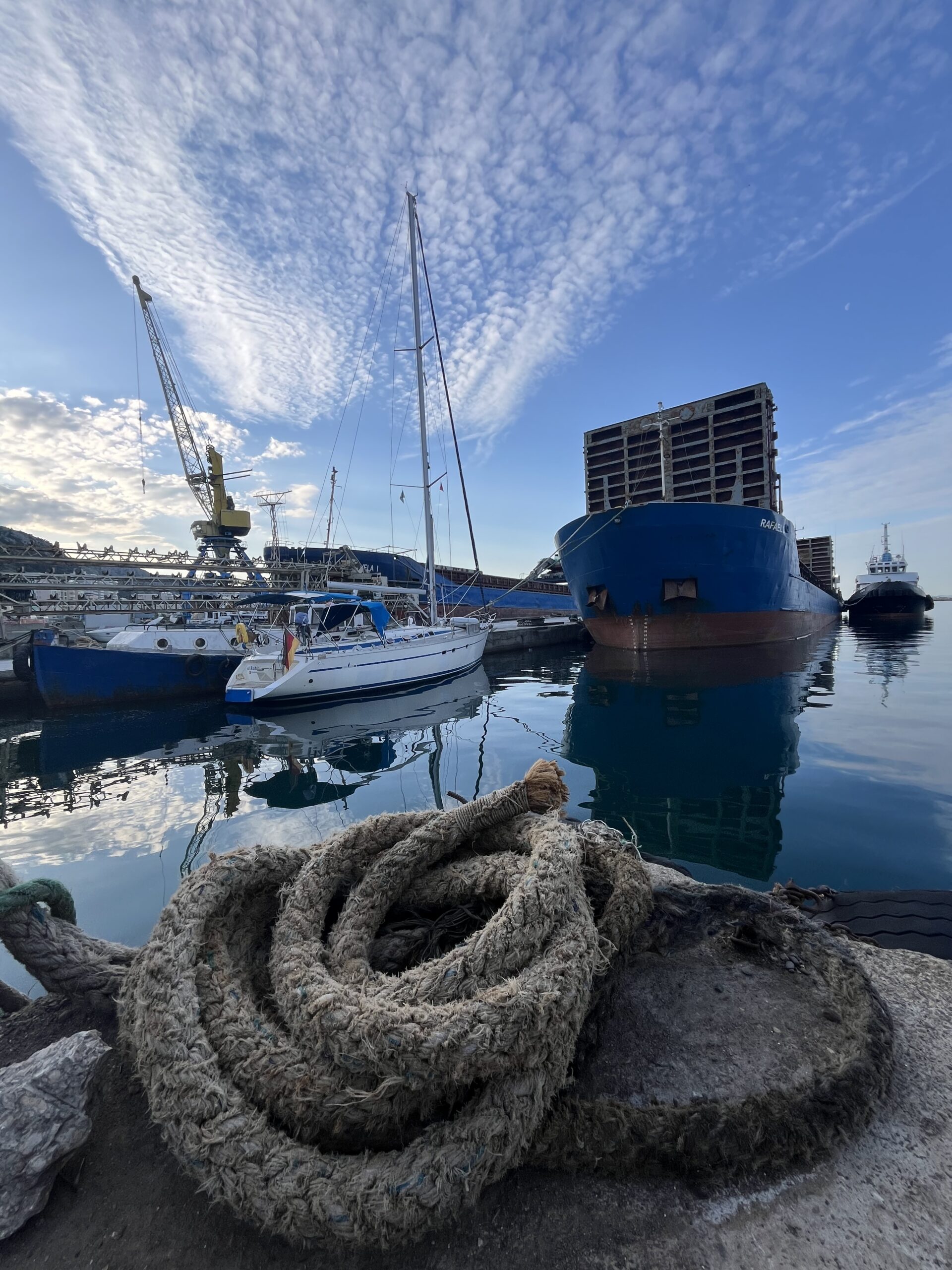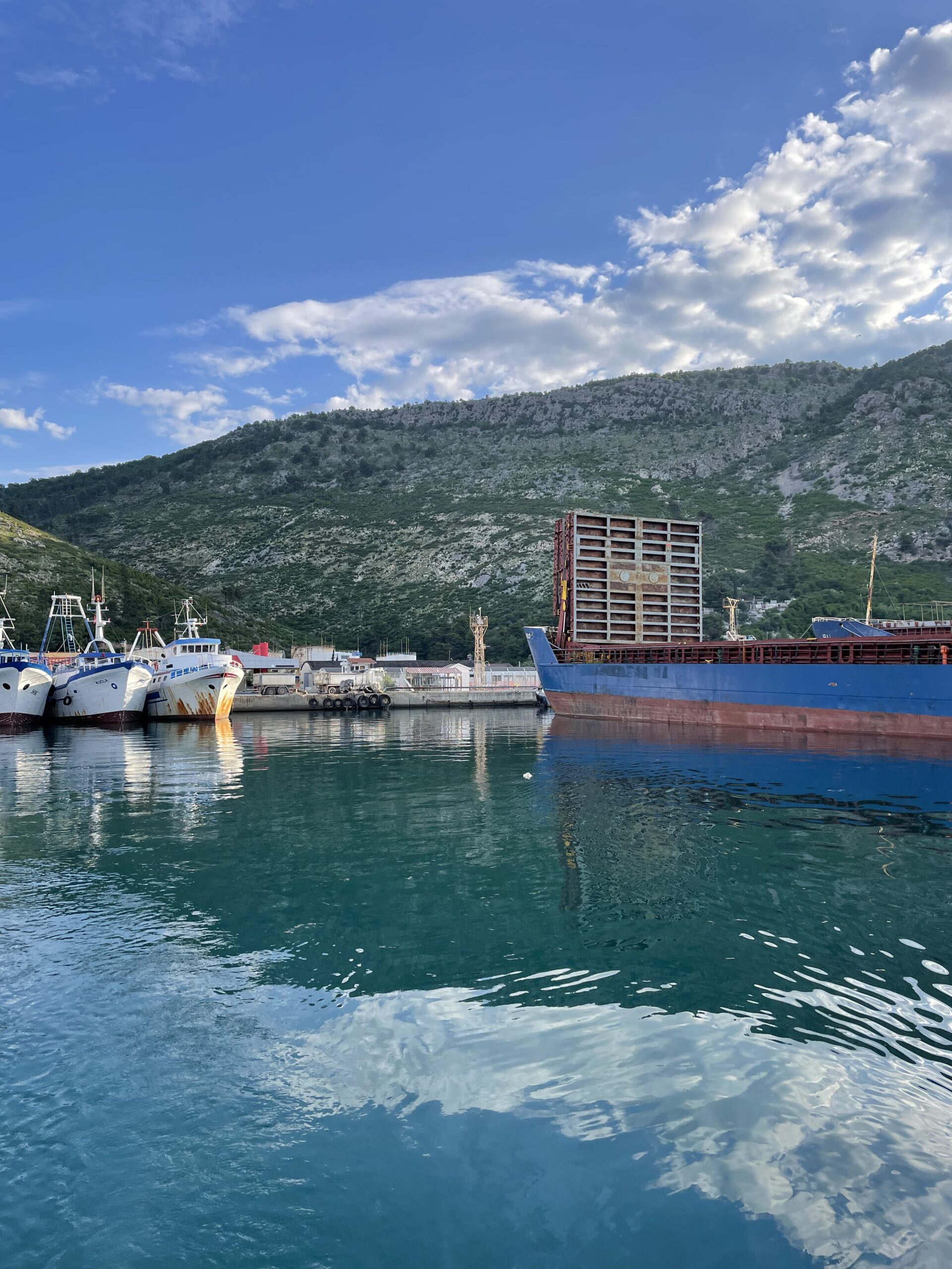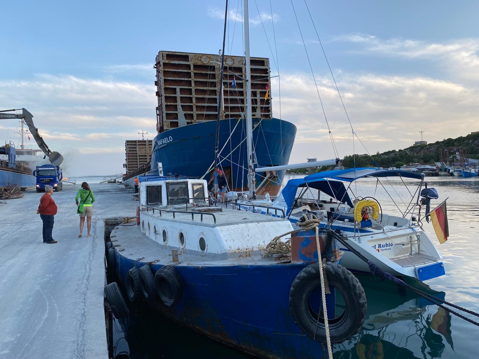 Er wies uns an, in den Industrie-Hafen von Shengjin einzulaufen und zuvor noch die Hafenbehörde über Funk um Genehmigung zu bitten. So geschehen sind wir in den Hafen eingelaufen und haben Ausschau nach Mr. Frock gehalten. Irgendwann haben wir dann einen älteren Herren mitten in einer Staubwolke wild gestikulierend entdeckt und waren uns sicher, das muss er sein! Er stand dabei zwischen zwei Frachtschiffen, von denen eines gerade mit Schotter beladen wurde. Den Handzeichen nach sollten wir an dem zweiten Frachter vorbei fahren. Im hintersten Eck des Hafens stand vor dem Frachter noch ein alter Kahn, der zumindest noch schwimmfähig schien. An diesem haben wir schließlich längsseits festgemacht. Was für ein Abenteuer! 😮