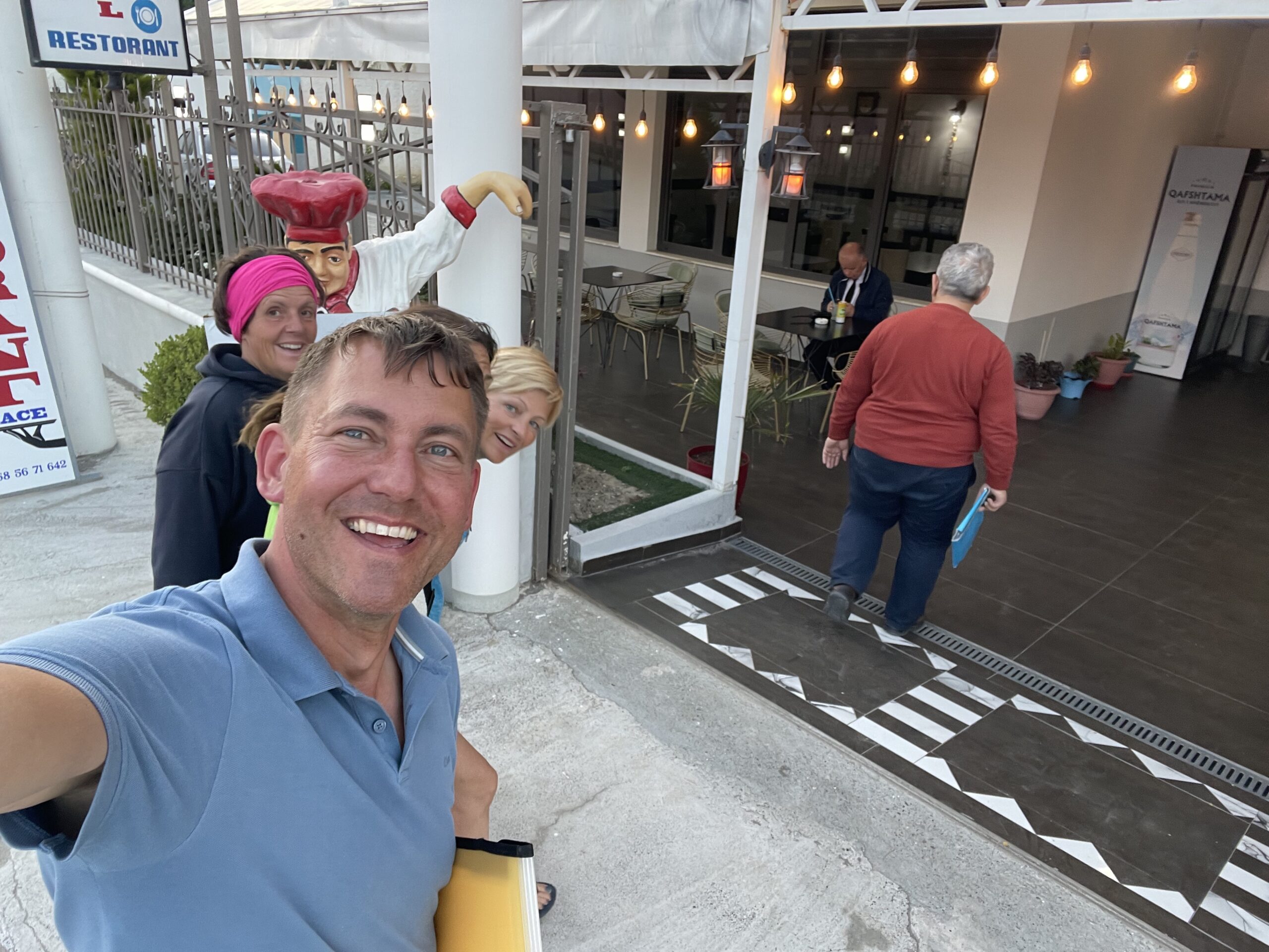 Nachdem wir fest waren, sollten wir uns für die weiteren Formalitäten zum Einklarieren in seinen alten Mercedes setzen. Nach kurzer Irritation saßen wir alle im Auto und fuhren 500 m aus dem Hafen raus in eine albanische Kneipe. Dort haben wir dann während eines Anlegebiers die Dokumente ausgefüllt und Mr. Frock unsere Ausweise übergeben. Dann fuhr er davon um 10 Minuten später wieder zurück zu sein. Zufällig saß am Nebentisch auch der Hafenkapitän von Shengjin. 😉 Anschließend hat uns Mr. Frock noch kurz durch Shengjin gefahren und uns an einem Restaurant rausgelassen. Hier haben wir lecker gegessen und sind anschließend zurück zum Hafen gelaufen. Gleich hinter unserem Boot saß der Wachmann und begrüßte uns noch herzlich. Sehr beruhigend. 😊