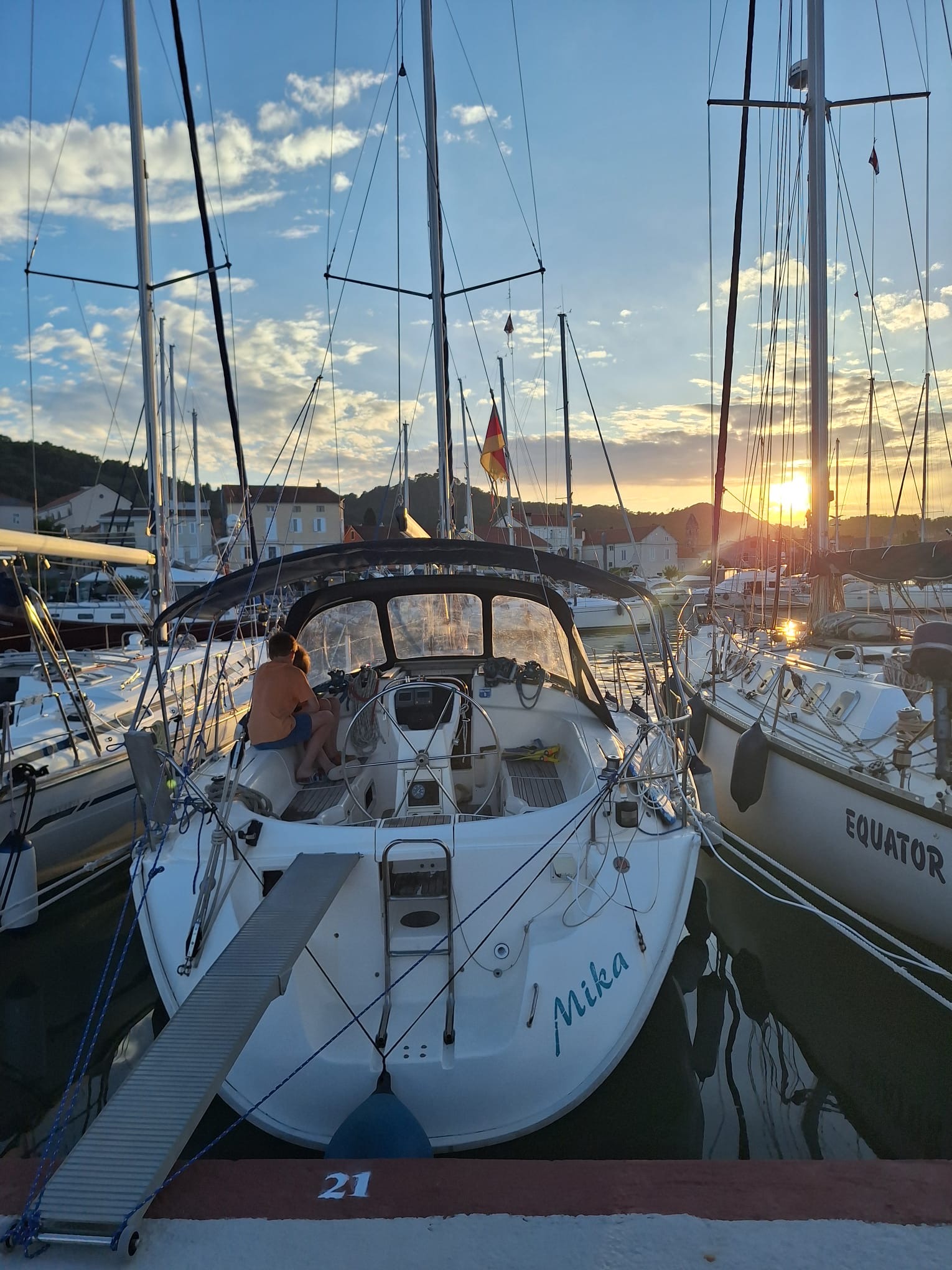 Dort sind wir dann am frühen Abend gut angekommen und haben an der Stadtpier festgemacht. Nach einem abendlichen Spaziergang durch den Ort und einer ruhigen Nacht hat mich Nici dann am nächsten Morgen ein Stück in den Mast hochgezogen. So konnte ich die beschädigten Stellen im Segel notdürftig mit Segeltape reparieren. Damit sollten wir erst einmal wieder segeln können. 👍