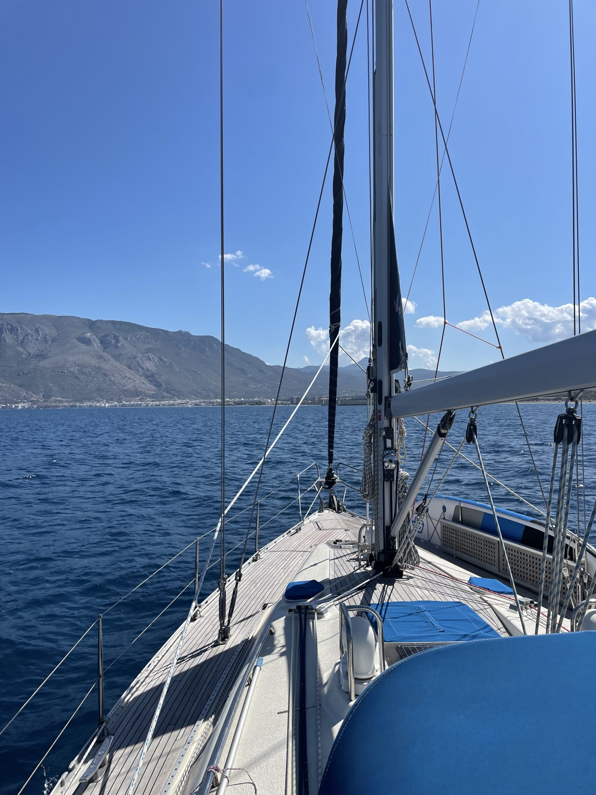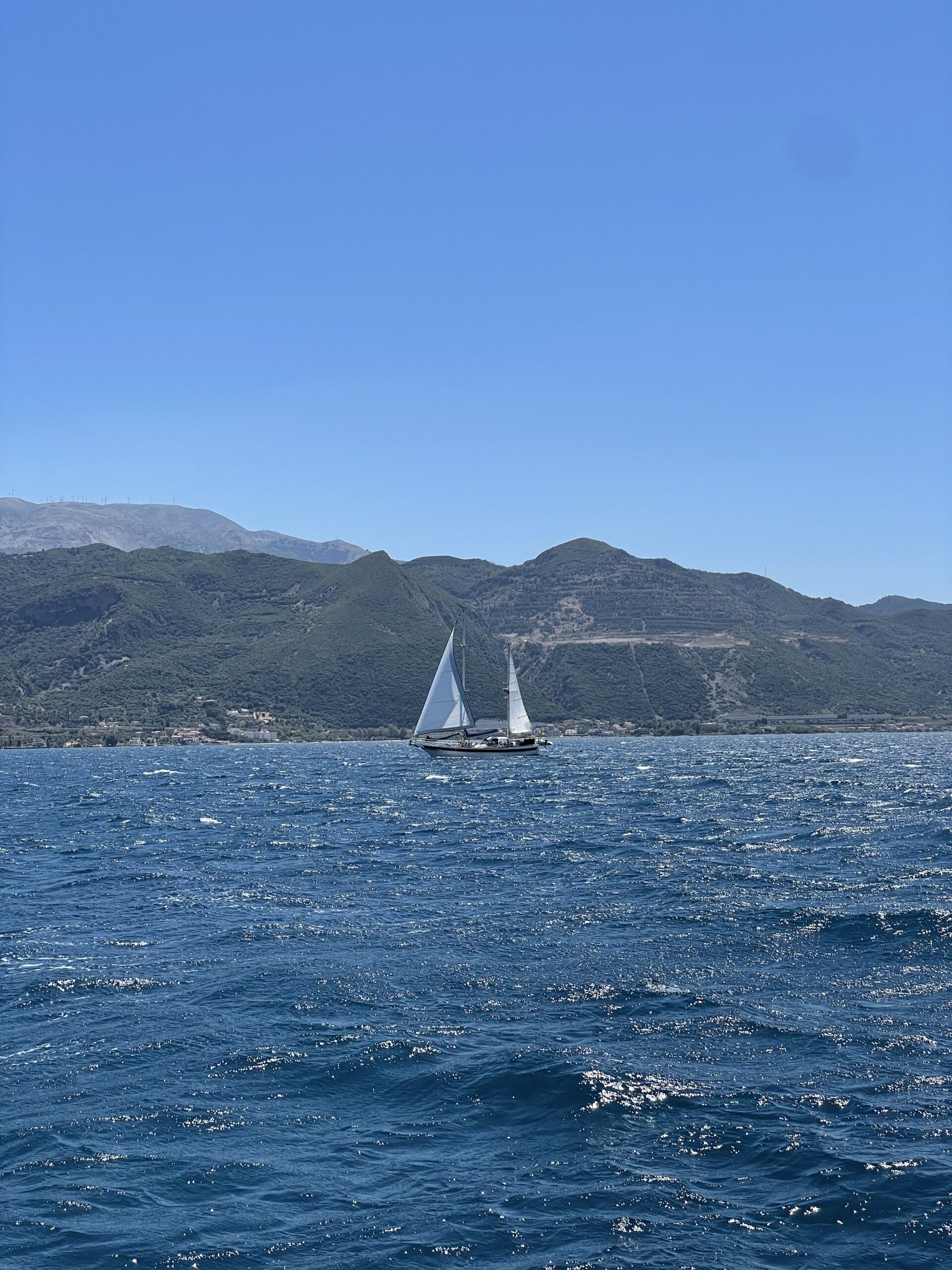 Auf dem weiteren Weg nach Galaxidi nahm der Wind immer weiter zu. Bei Raumwindkurs hatten wir das Vorsegel bereits eingerollt und fuhren nur noch mit dem Großsegel, dieses allerdings noch in voller Größe.
