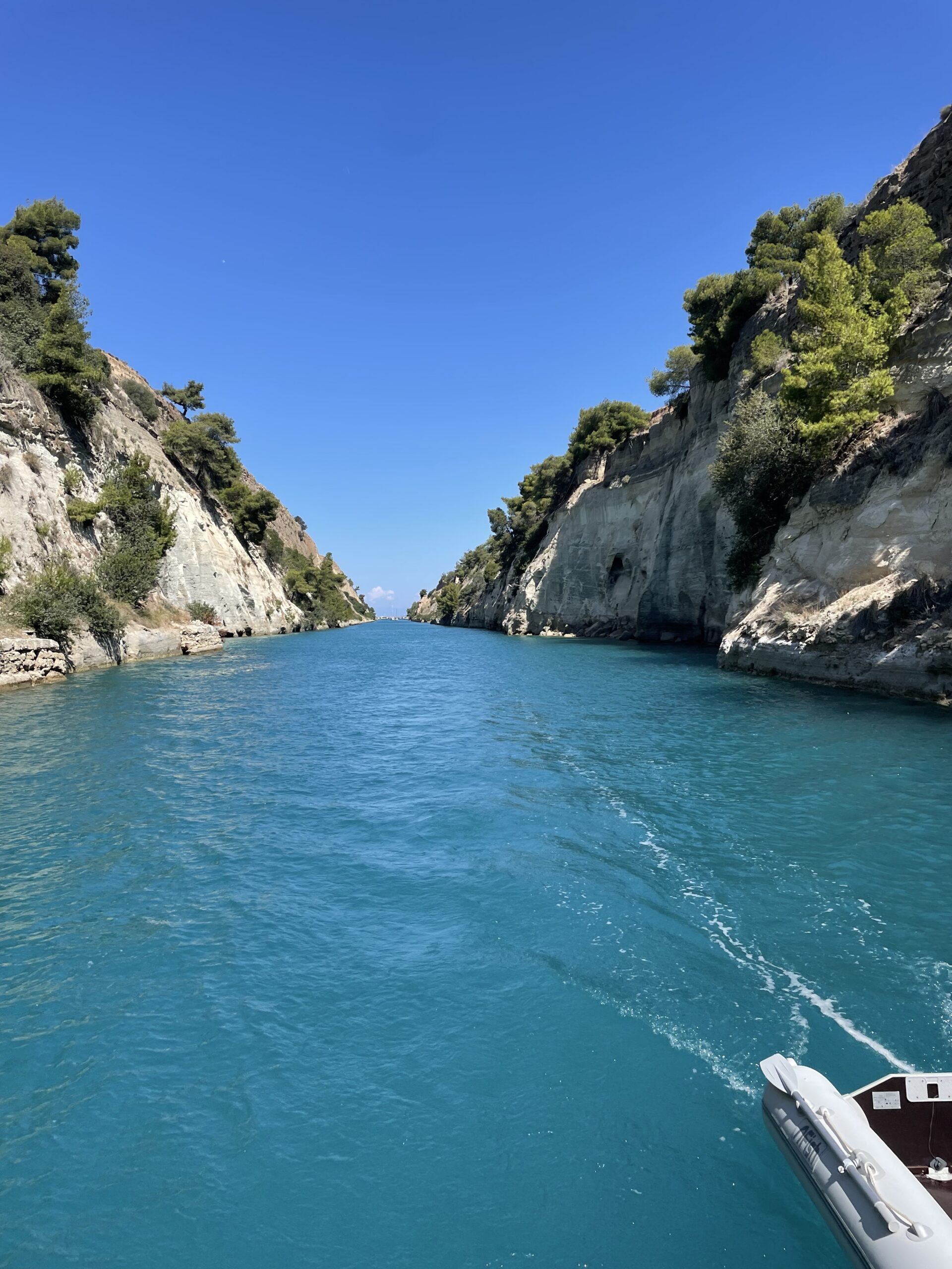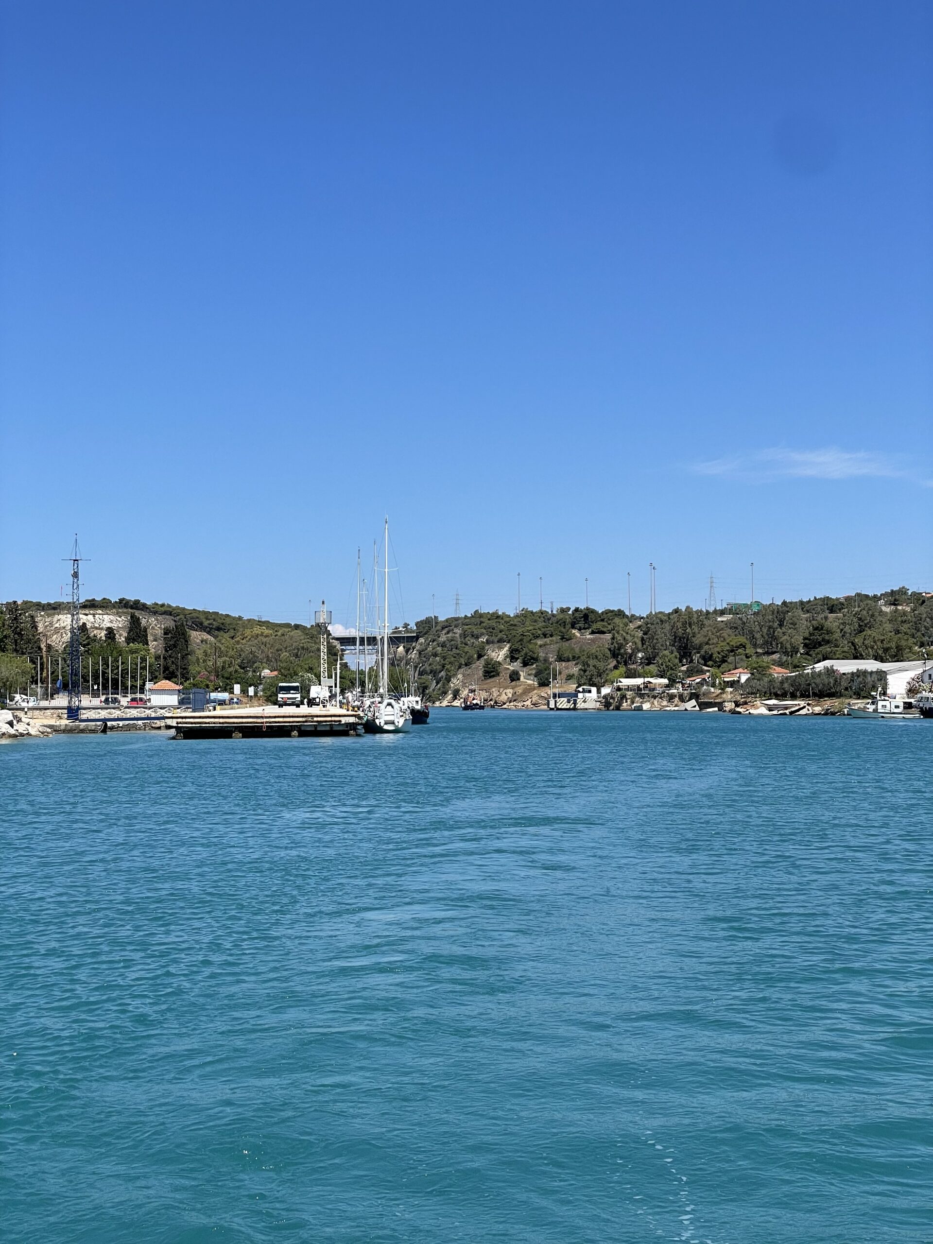 Nach der Durchfahrt von Nord nach Süd machten wir an der Zahlstelle fest. Knapp 250,- Euro kostete die Durchfahrt für unser Boot. Nicht günstig aber es hat sich auf jeden Fall gelohnt. Jetzt waren wir im saronischen Golf! Wir segelten noch ein Stück weiter, zwischen den vielen auf Reede liegenden Schiffen und ankerten später in einer Bucht auf der Insel Salamina.