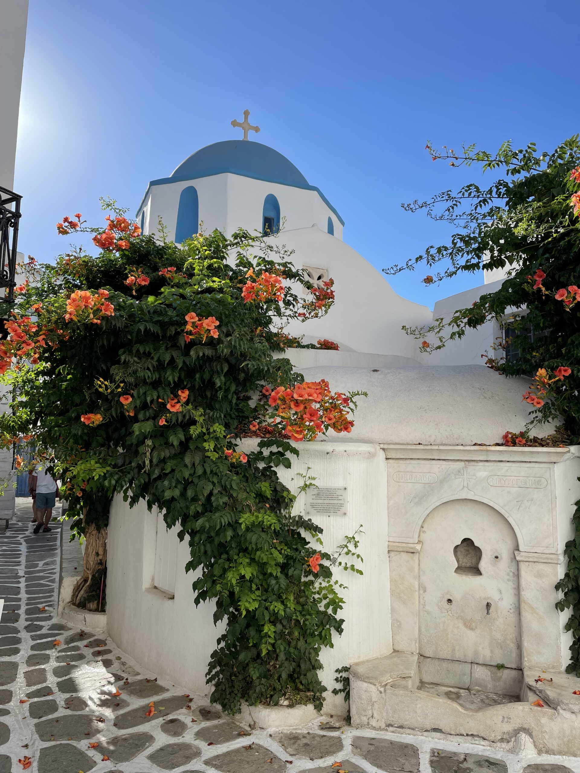 Nach einem entspannten Vormittag, haben wir uns am Nachmittag die Stadt Paros angesehen und setzten hierzu mit dem Beiboot über. Normalerweise ist dieses für 2-3 Personen ausgelegt. Dennoch fuhren wir alle vier gemeinsam über die Bucht. Am Ende hatten wir alle nasse Hosen, was bei den nach wie vor sehr warmen Temperaturen nicht wirklich schlimm war. 😂