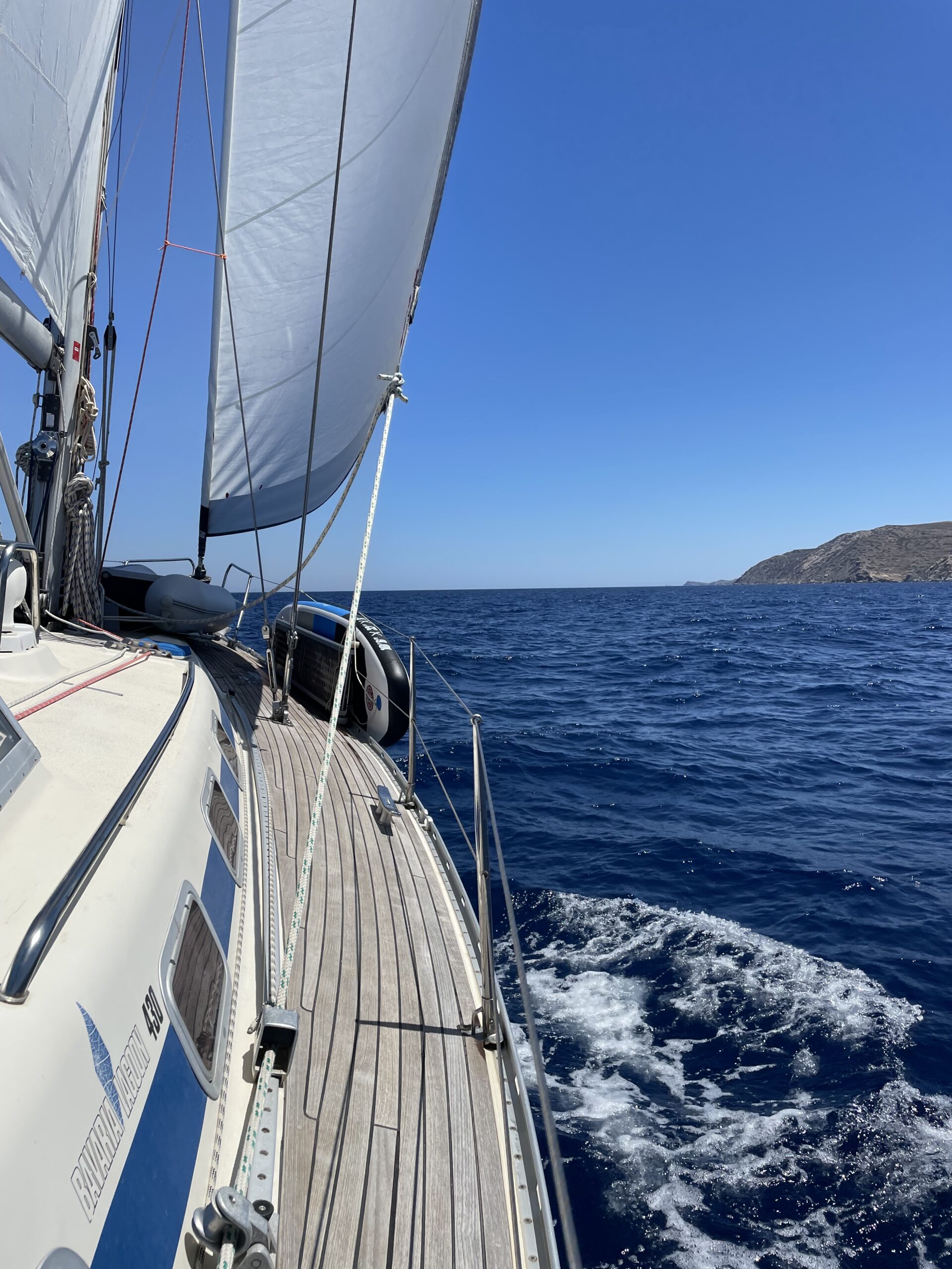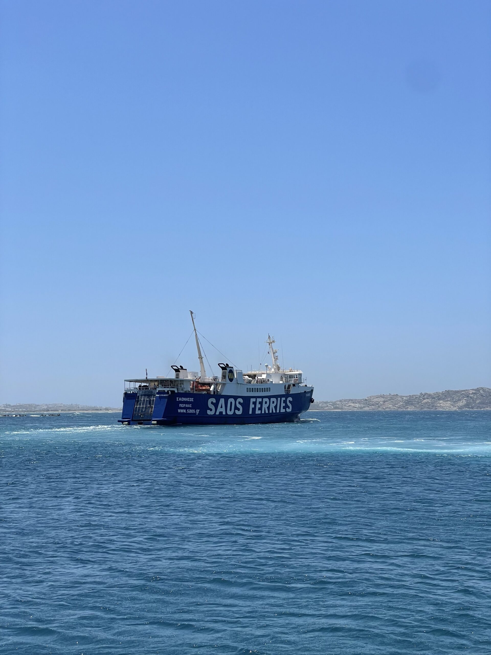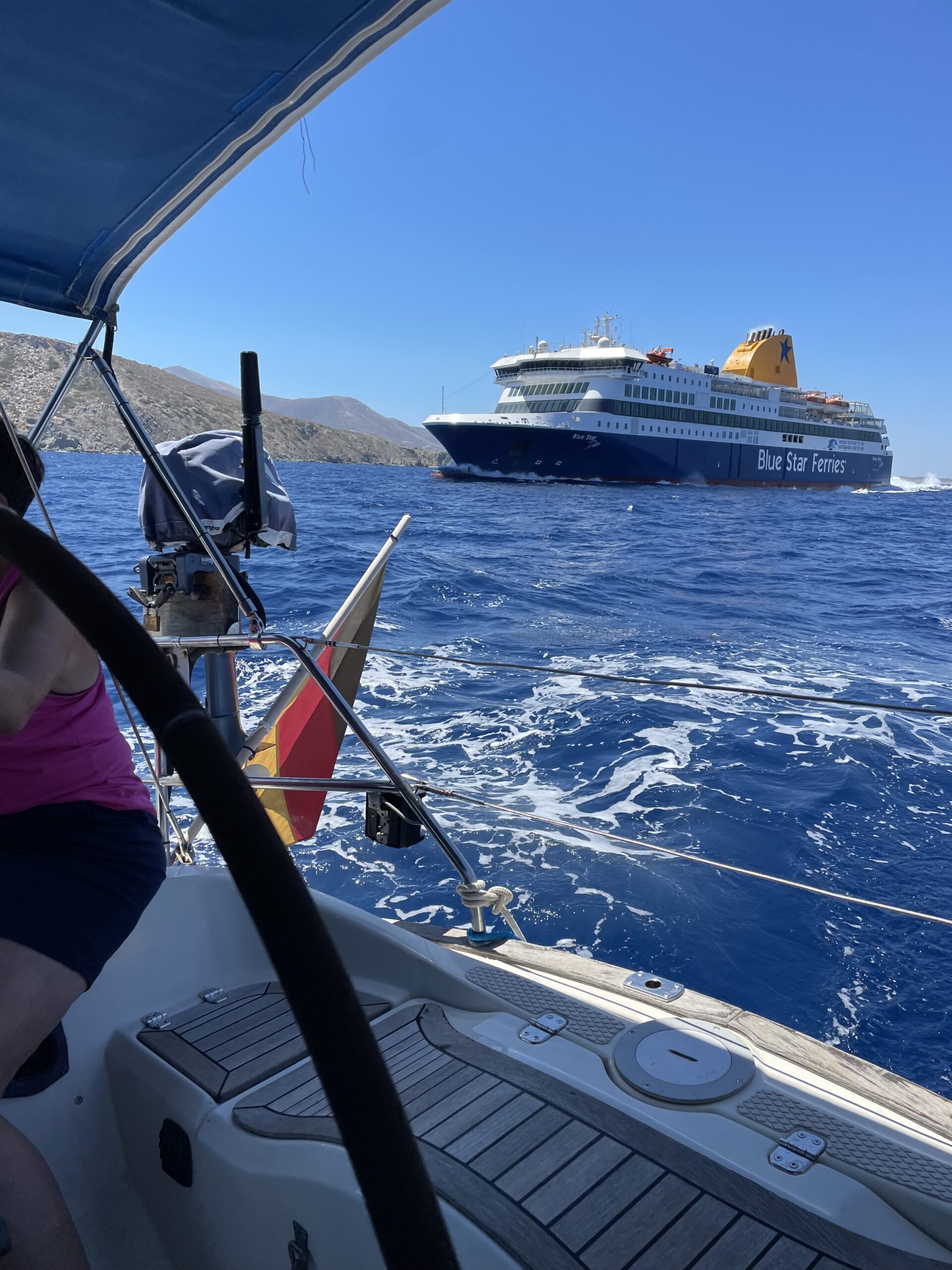 Da für die nächsten Tage der Meltemi deutlich zunehmen sollte, entschieden wir uns, von Paros nach Naxos zu segeln und dort im Hafen festzumachen. So gingen wir Anker auf und verließen die schöne Bucht Paroikas auf Paros. Auf unserem Weg entlang an der nördlichen Küste von Paros wurden wir von einer großen BlueStar-Fähre mit einem sehr geringen Abstand überholt. Die Fähre war in voller Fahrt und produzierte eine steile, ca. 2 Meter hohe Welle! Mit einem schnellen Manöver nahmen wir die Welle mit dem Bug voraus, denn seitlich wären wir ganz schön rumgeworfen worden. So nah fährt man eigentlich nicht vorbei. Leider gibt es in Griechenland mit den Fähren immer wieder Probleme. 😡