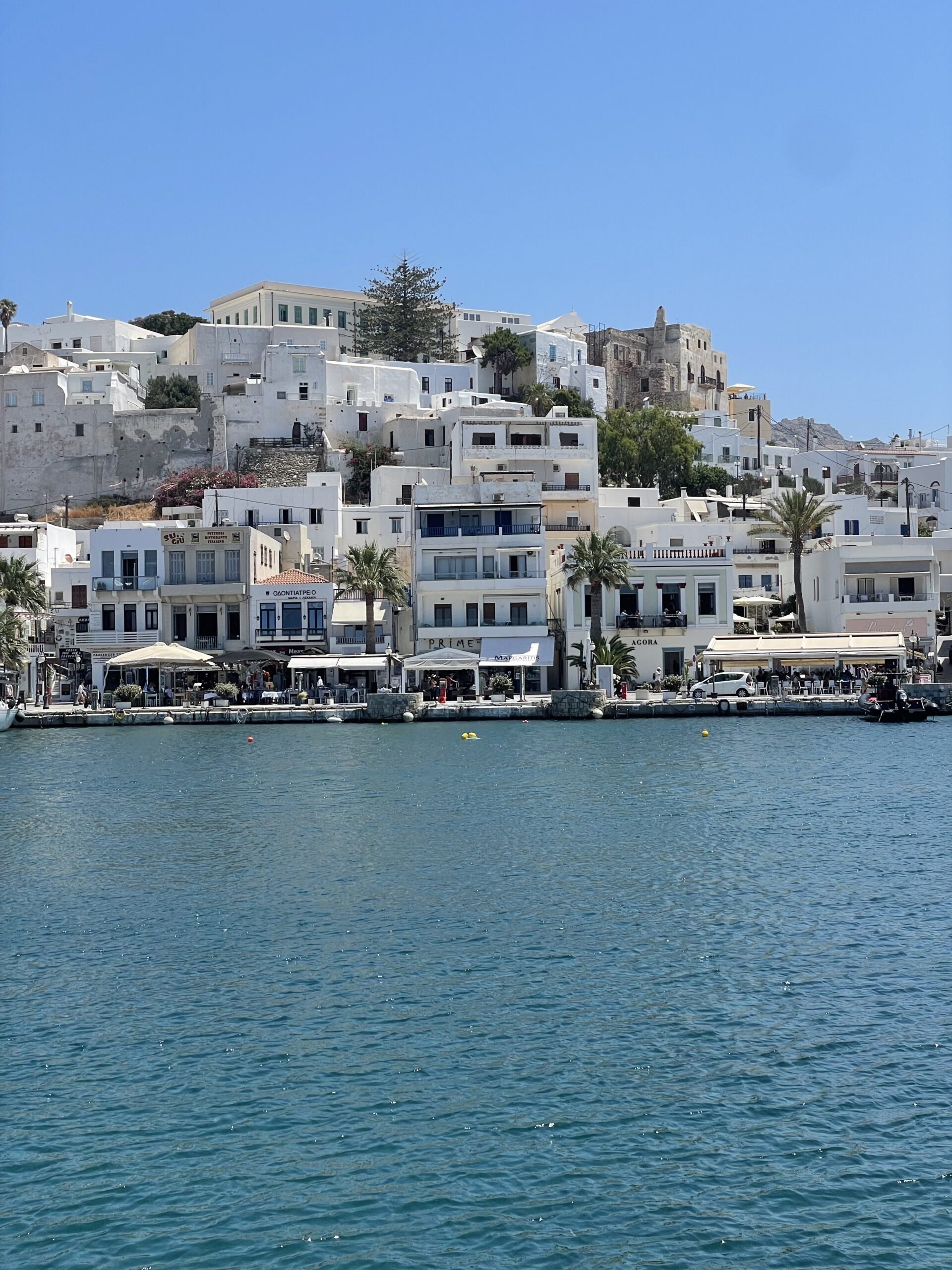 Mit zunehmendem Meltemi erreichten wir Naxos zügig. Da man in Griechenland keine Liegeplätze in den Stadthäfen reservieren kann, ist es immer spannend, ob denn auch ein Platz im Hafen frei ist. Nach Rücksprache mit dem Hafenmeister mussten wir zunächst vor Anker gehen. Doch kurz darauf meldete er sich nochmals und gab grünes Licht zur Einfahrt in den Hafen. Wir machten mit Mooringleine und Achterleinen fest. 👍