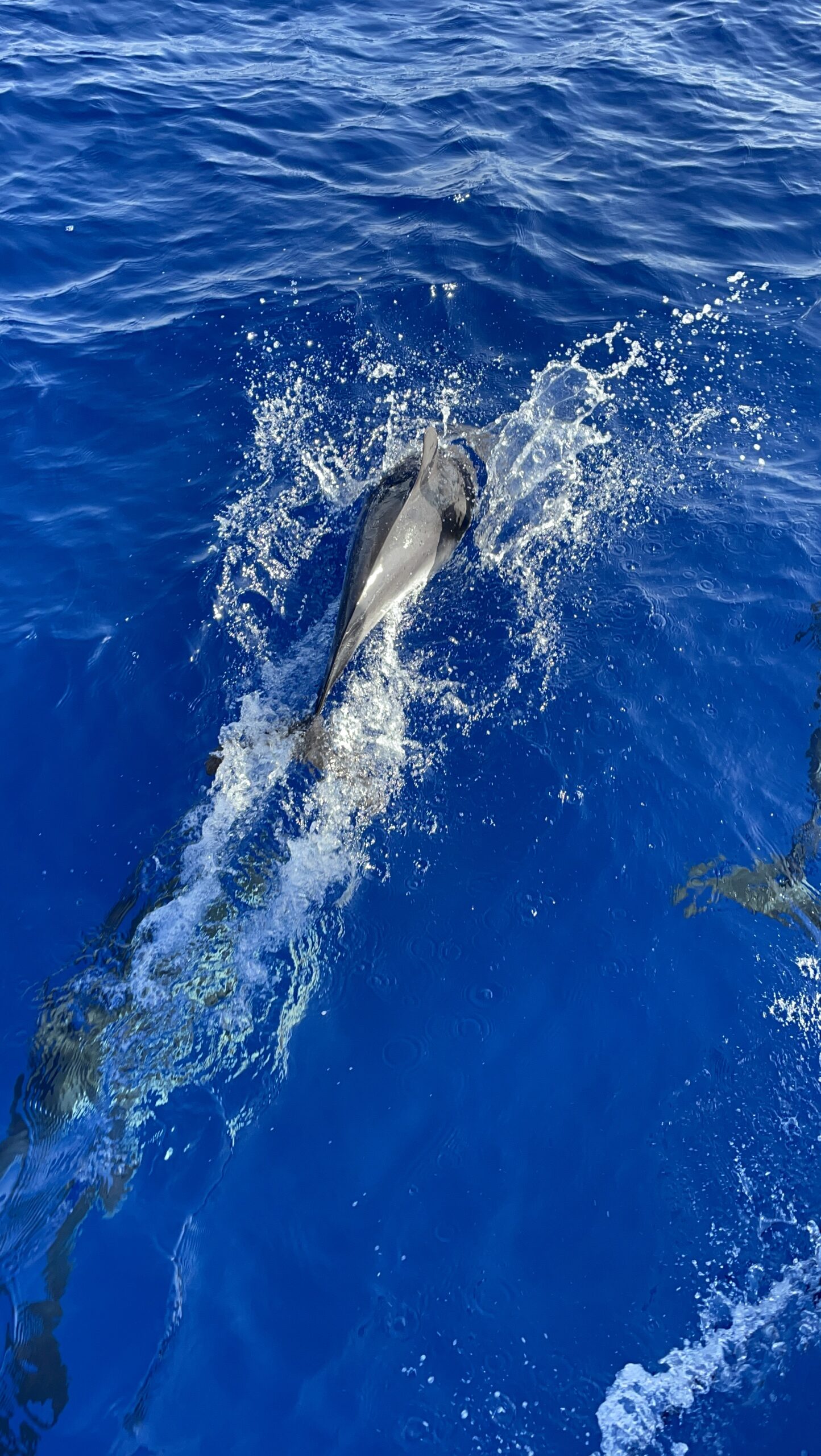 Am nächsten Morgen gingen wir Anker auf und segelten nördlich um Kea herum. Der Wind frischte am Nachmittag etwas auf. Immer noch aus Süd bis Südwest kamen wir auf Amwind-Kurs gut Richtung Kythnos voran. Das Highlight an diesem Tag war die Begegnung mit einer kleinen Gruppe von Delfinen. Sie kamen seitlich an uns heran und haben uns dann ein Stück am Bug begleitet. So hatten wir das bisher auch noch nicht erlebt. Eine tolle Begegnung! 🐬