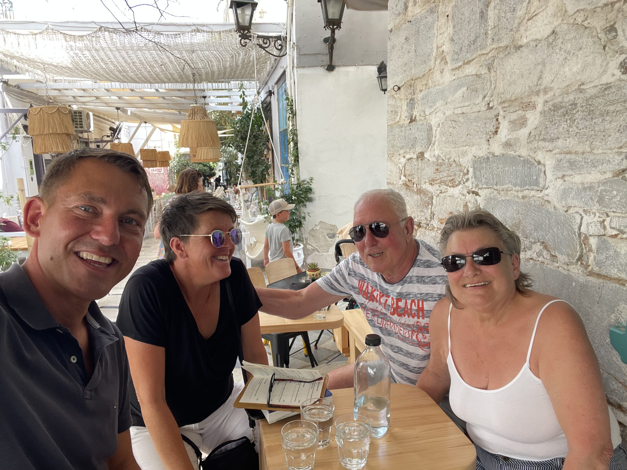 Von dort aus fuhren wir mit dem Taxi – angeblich das erste der Inselgeschichte – auf die andere Seite der Insel in die “Hauptstadt“ Ermoupoli. Mit über 11.000 Einwohnern ist sie die größte Stadt in den Kykladen. Bei heißen Temperaturen schlenderten wir durch die Gassen und haben lecker in einer Taverne gegessen. Meinen Eltern war es hier definitiv zu heiß und so sind sie nach dem Essen mit dem Taxi wieder zurück zum Boot gefahren.